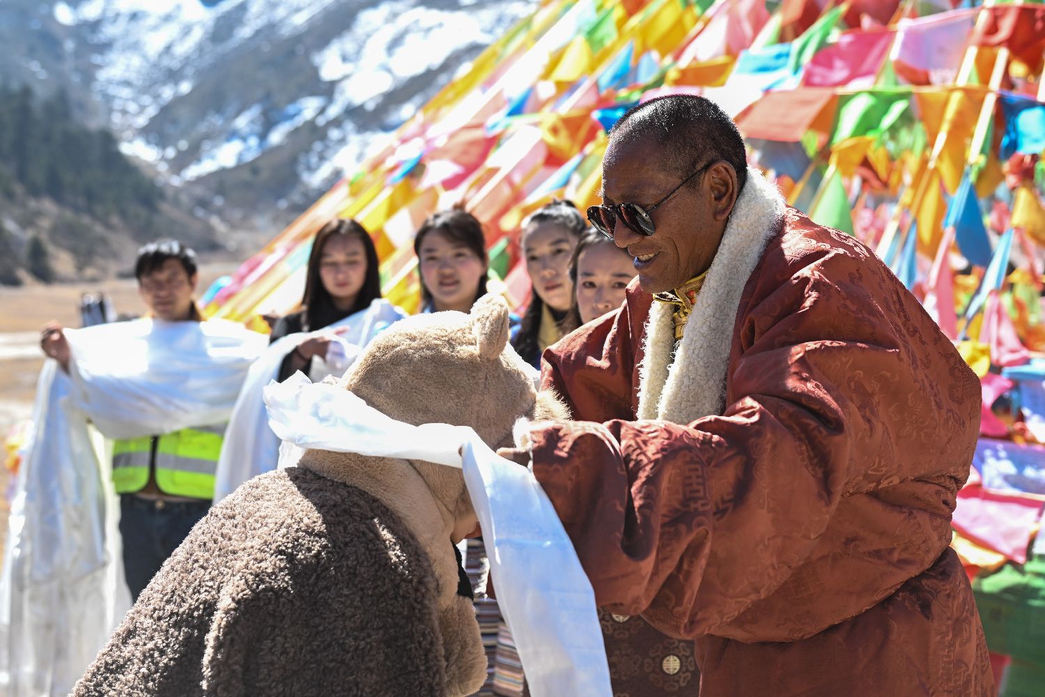 3月11日,巴拉格宗景区创始人斯那定珠(左一)为首批体验自驾的游客献哈达。中新社