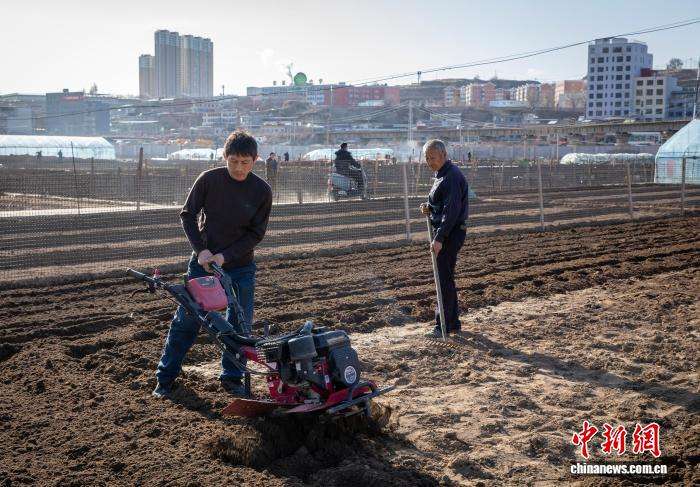 山西柳林穆村镇的农民用机器进行耕种栽蒜。中新网