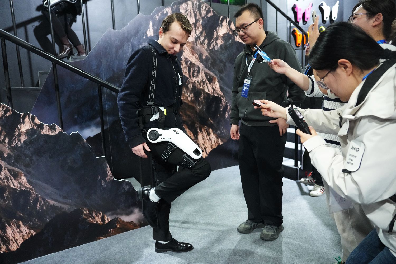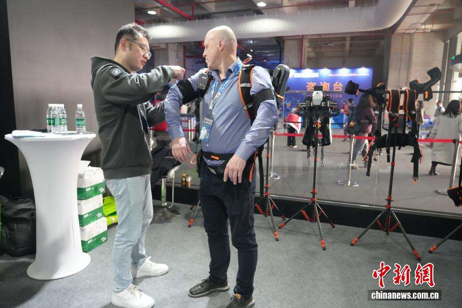 3月12日,2026中国家电及消费电子博览会在上海开幕。本届AWE以“AI科技慧享未来”为主题,首次创新启用“一展双区”的模式,在上海东方枢纽国际商务合作区与新国际博览中心同步举办。展会聚焦智慧出行,具身智能,算力基础设施等领域的最新成果。图为人体外骨骼设备吸引观众体验。中新社