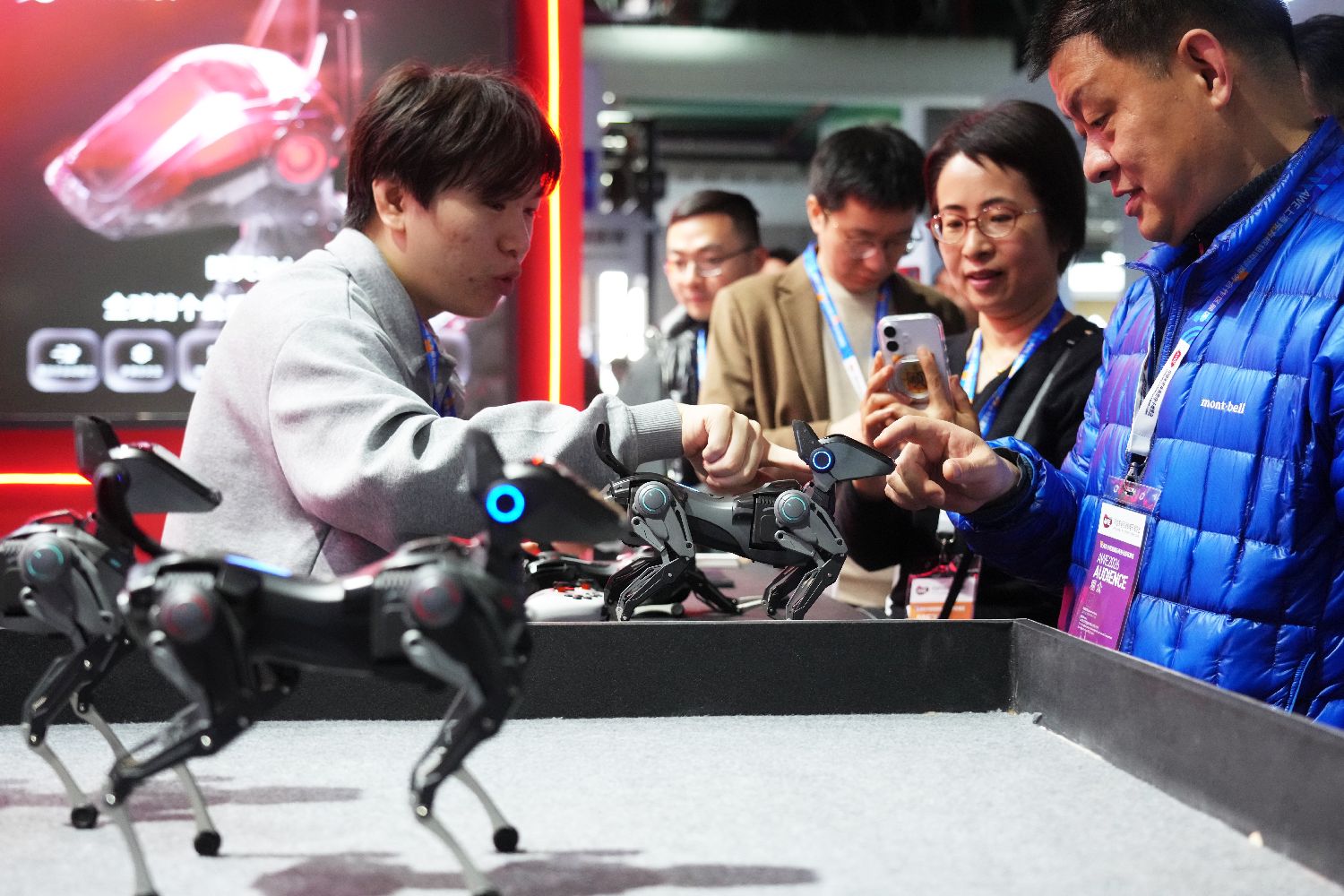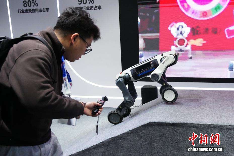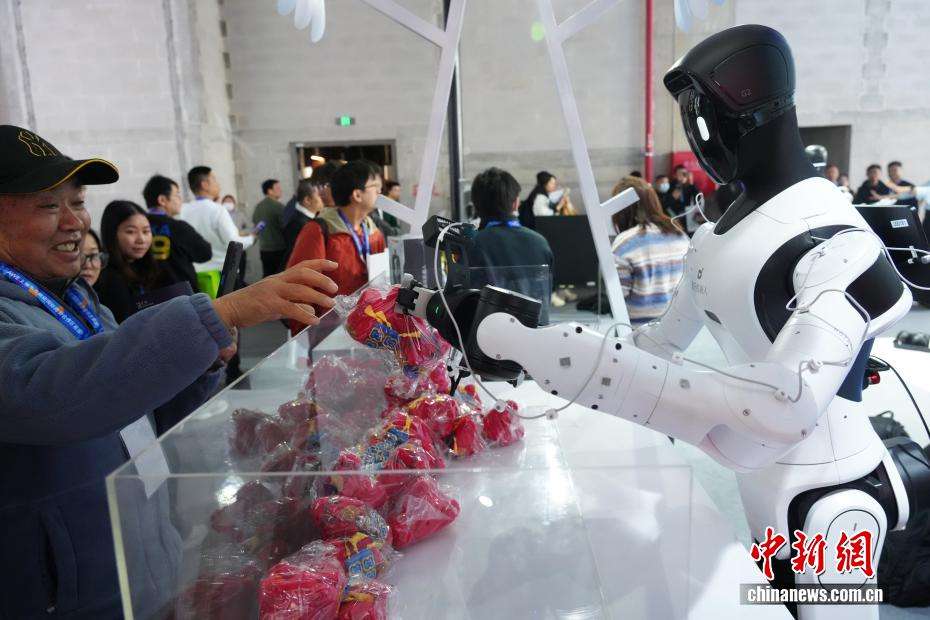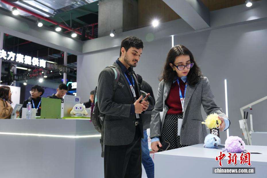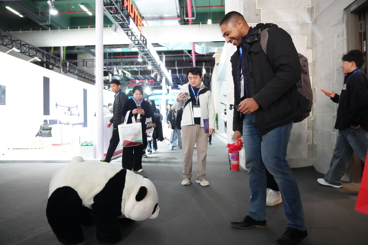 憨态可掬的机器熊猫与现场观众趣味互动。中新社