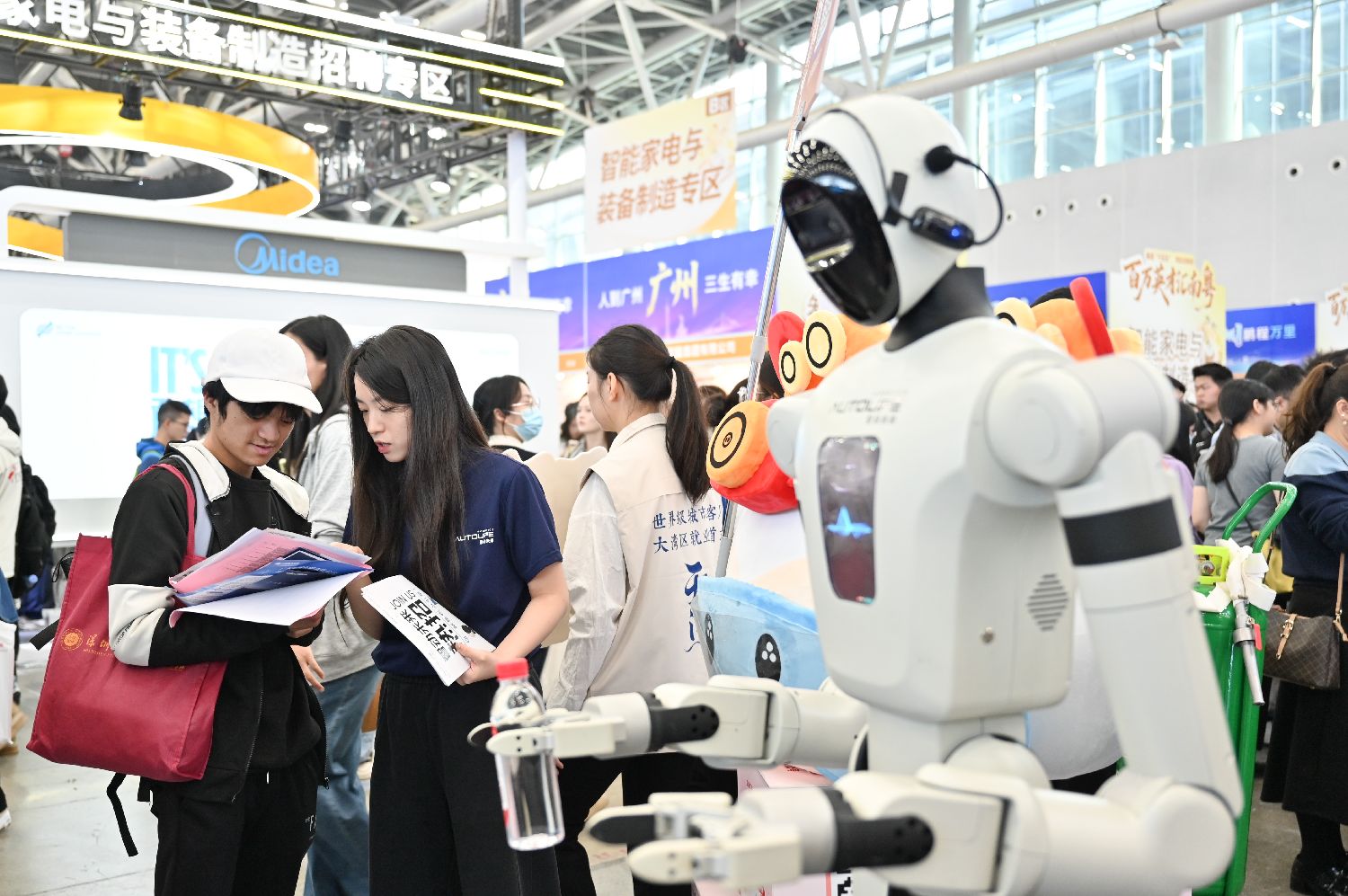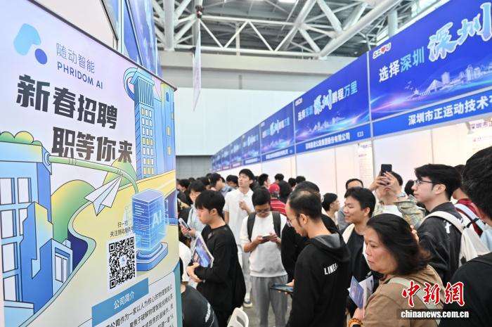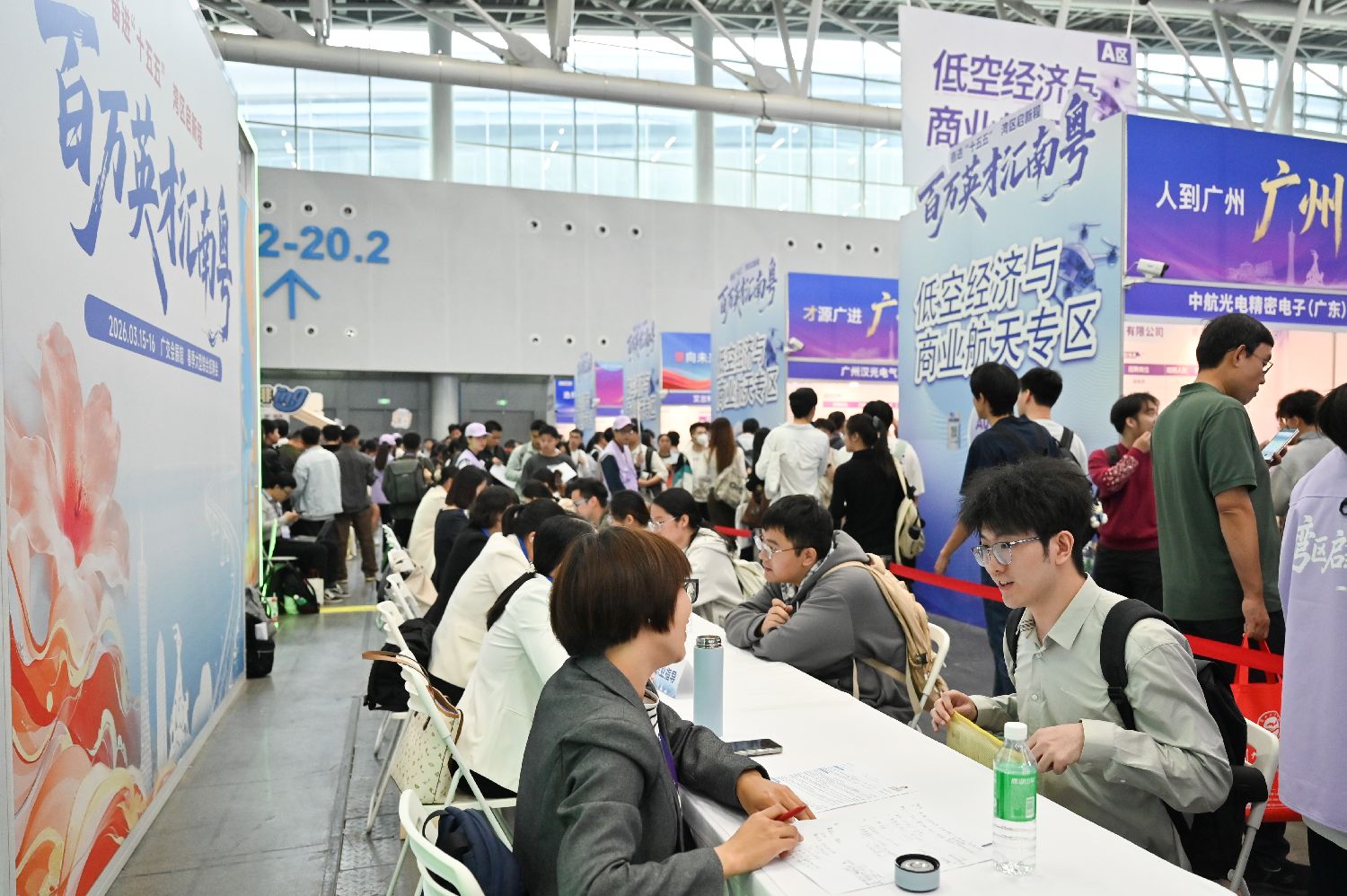 3月15日,“百万英才汇南粤”2026春季大型综合招聘会在广州广交会展馆开幕。本次招聘会以“粤聚英才 粤见未来”为主题,以“先进制造”与“现代服务”的双馆分区联动模式,汇聚近2000家单位,提供超8.5万个岗位。图为求职者在人工智能与机器人专区寻找工作机会。中新网