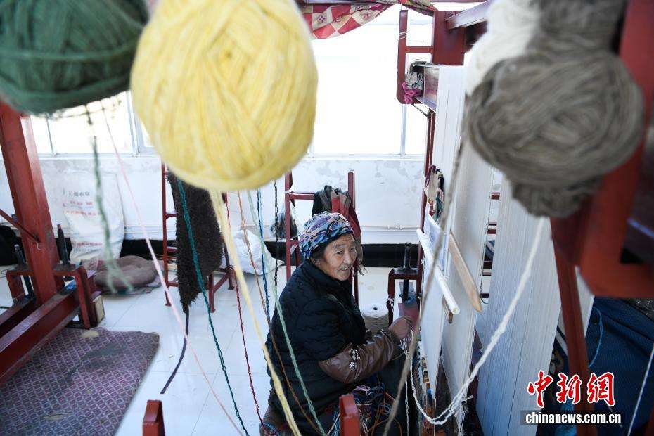 工人在挑选编织藏毯的毛线。中新网