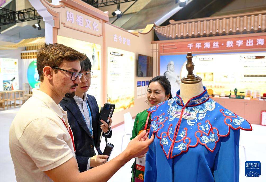 巴西客人(左一)在妈祖文化主题专区了解特色服饰。新华社