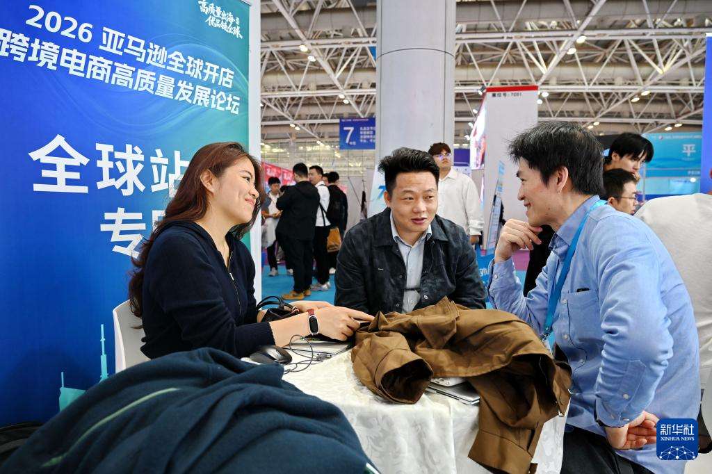 客商向参展商代表(右一)咨询商品跨境出海流程。新华社