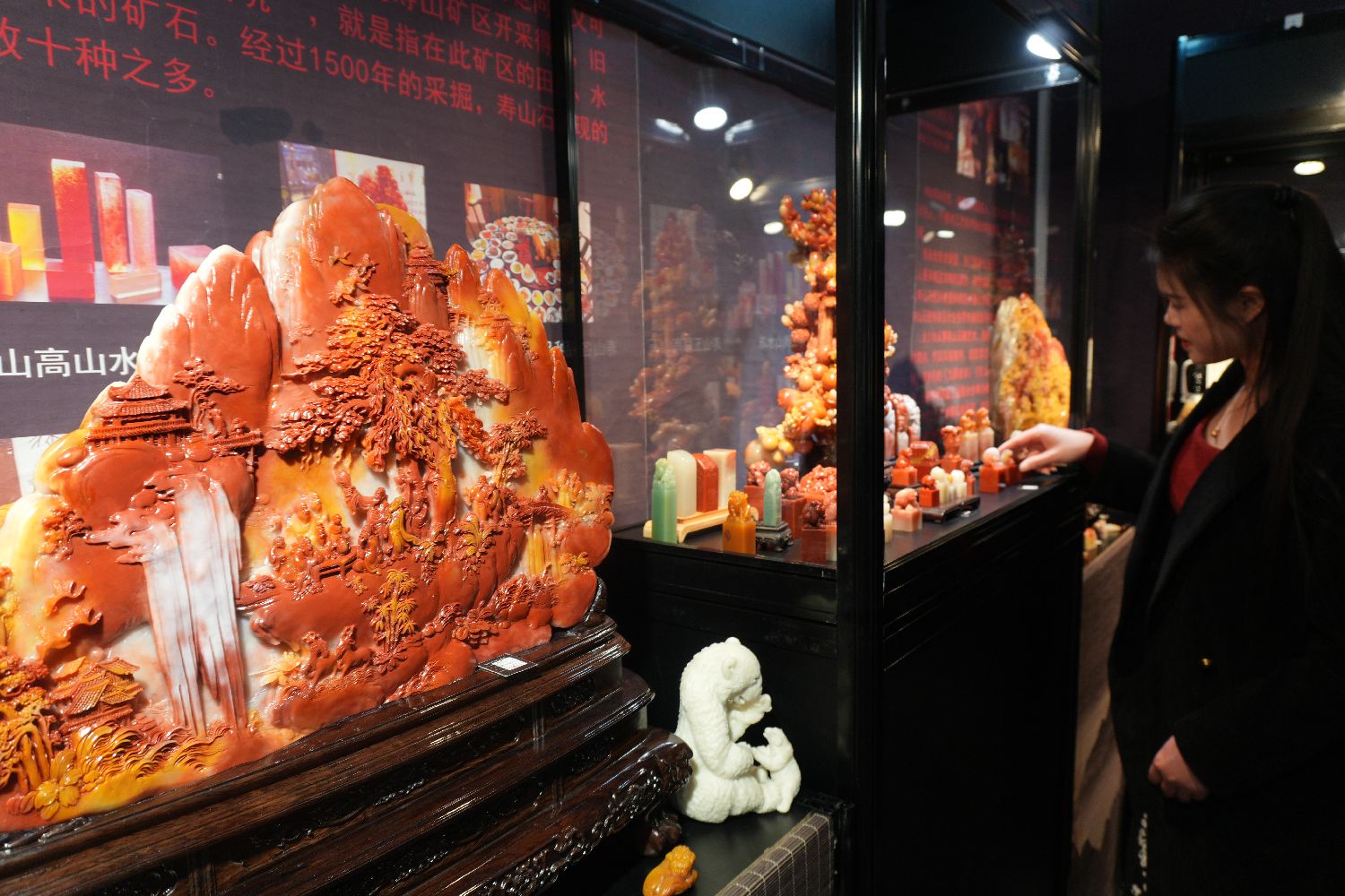 观众参观寿山石工艺品。
