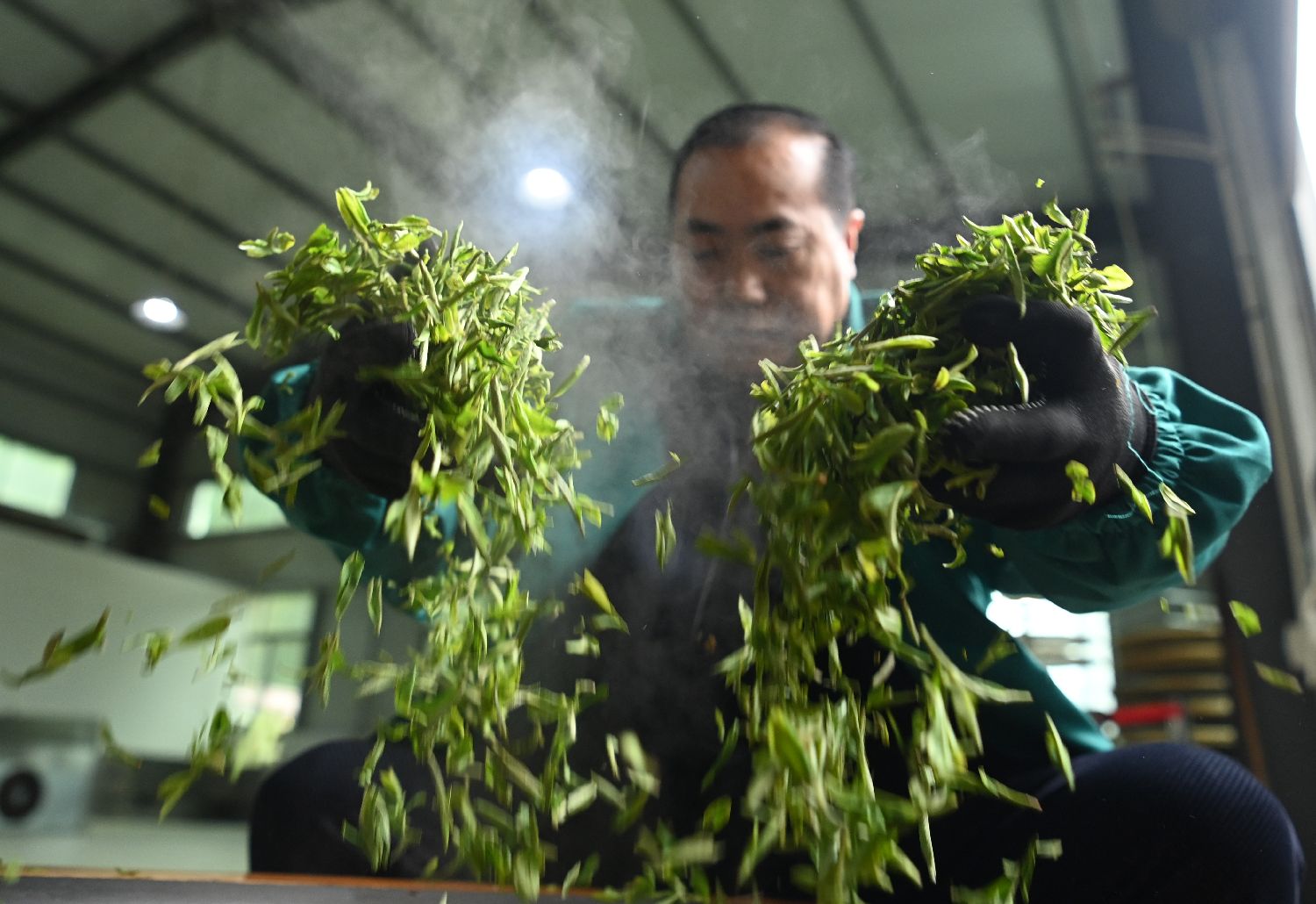 中国阳春三月,广西三江桃花映衬茶园,茶农抢采春茶;重庆秀山万亩茶田青翠欲滴,茶香四溢。两地同绘春日劳作画卷,生机盎然。 重庆秀山土家族苗族自治县钟灵镇深耕茶产业二十余载,建成近1.2万亩茶叶基地,年采摘茶叶1300余万斤。通过引育市场主体、健全加工体系,打造“钟灵毛尖”等36个系列产品,斩获多项绿色有机认证及市级、中国国家级茶业荣誉。该镇创新联农带农机制,农户凭借土地租金、务工、鲜叶销售实现稳定增收。依托数字化、标准化发展,小小茶叶成为当地助力乡村振兴、践行生态富民的特色支柱产业。图为3月24日,工人展示传统制茶技艺。中新社