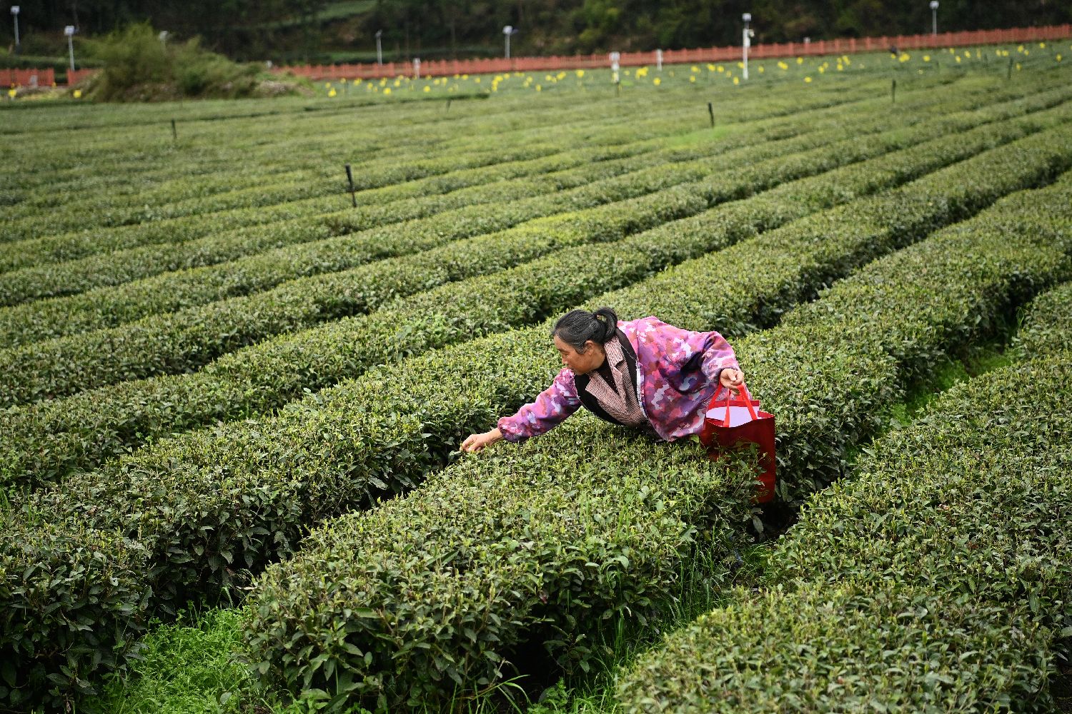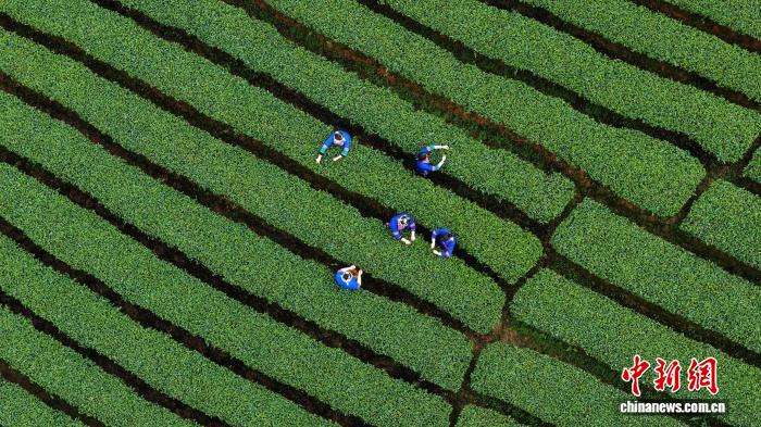 3月24日,广西三江侗族自治县良口乡寨塘村茶农穿梭于翠绿茶垄间抢采春茶。中新网