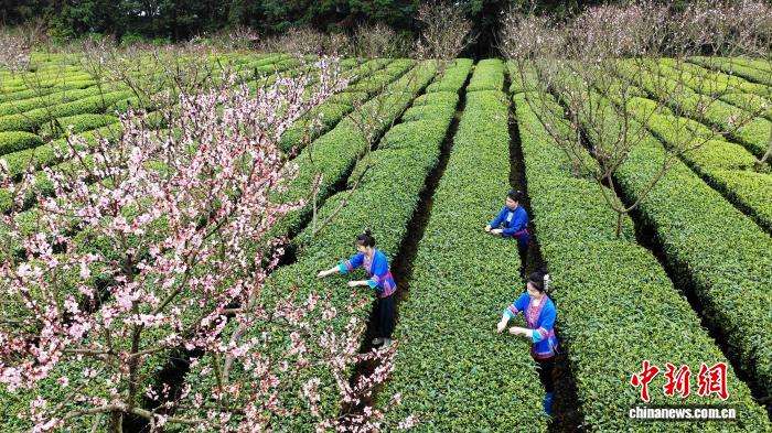 3月24日,广西三江侗族自治县良口乡寨塘村桃花迎春绽放,与层层叠叠的茶园相映成趣,茶农穿梭于翠绿茶垄间,巧手翻飞,抢采春茶。粉红的桃花、嫩绿的茶芽、忙碌的身影,共同勾勒出一幅诗意盎然的春日劳作画卷。图为茶农在采茶。中新网
