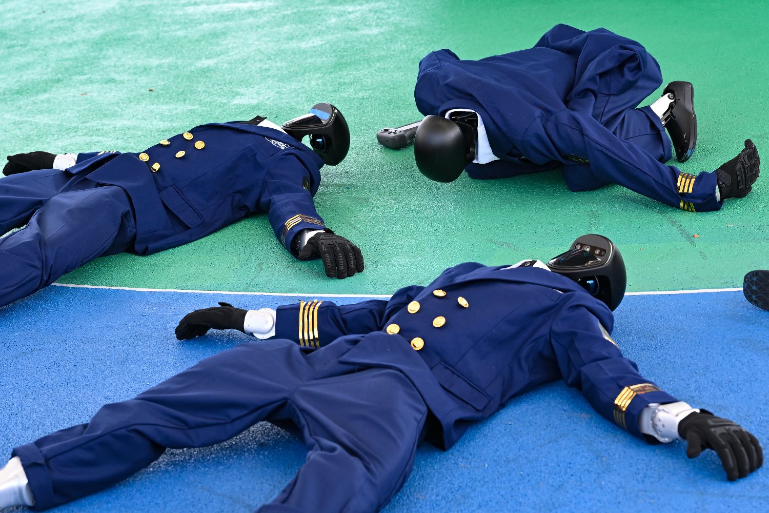 3月24日,参加舞蹈表演的机器人“下班后”席地而卧,让人忍俊不禁。