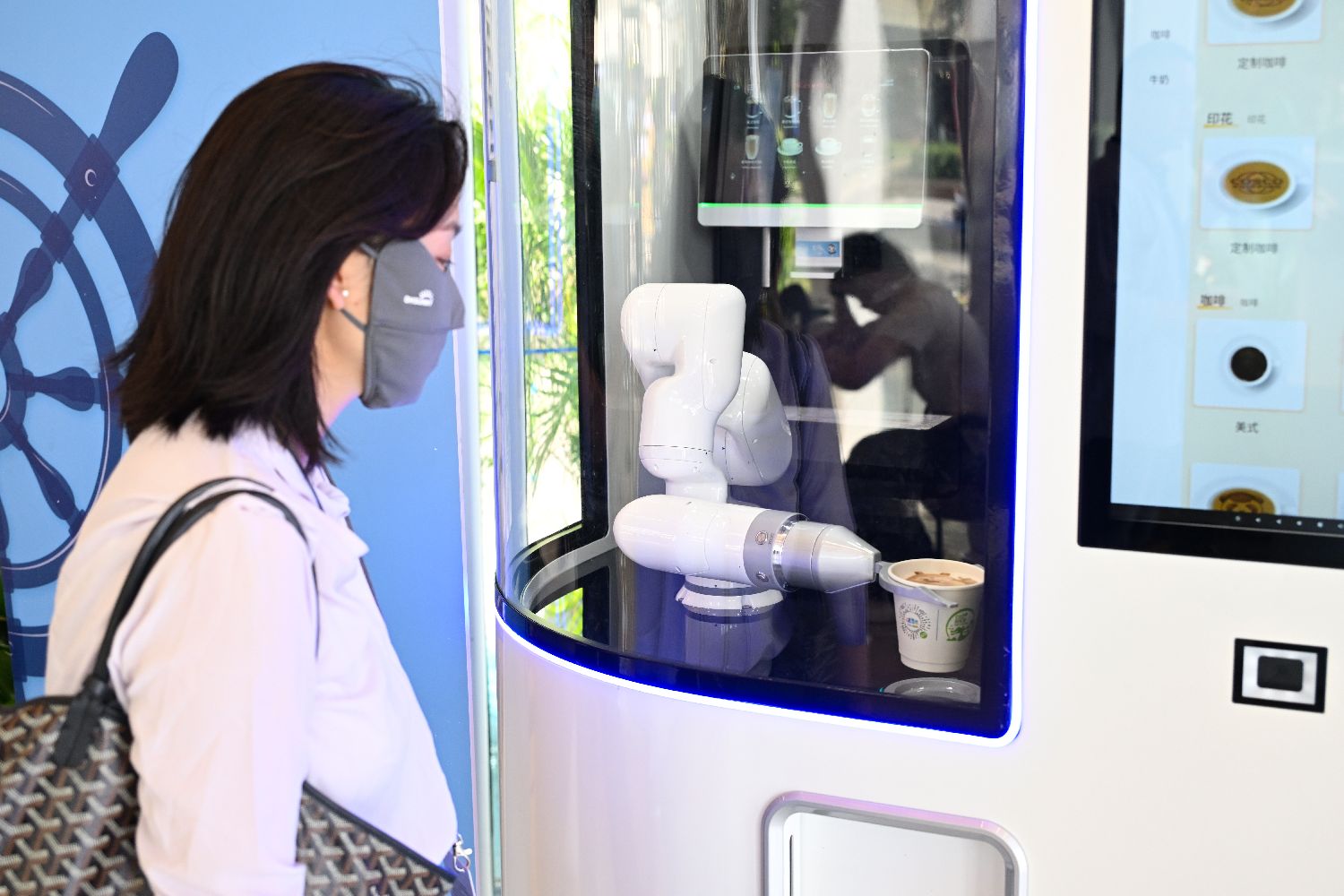 3月24日,舞蹈表演的机器人表演后与观众互动。