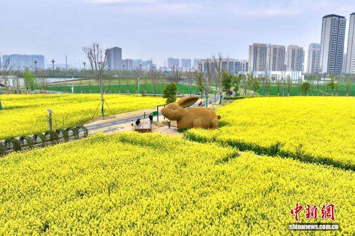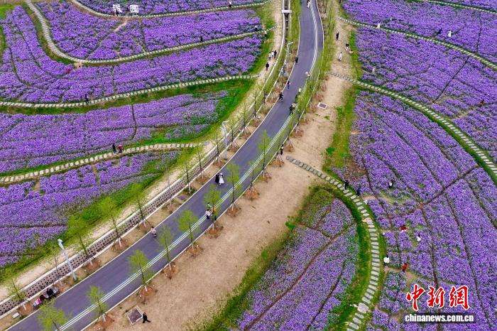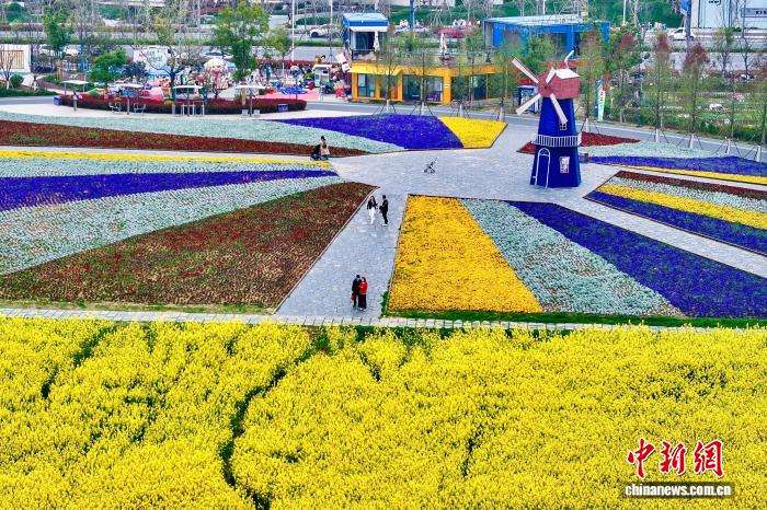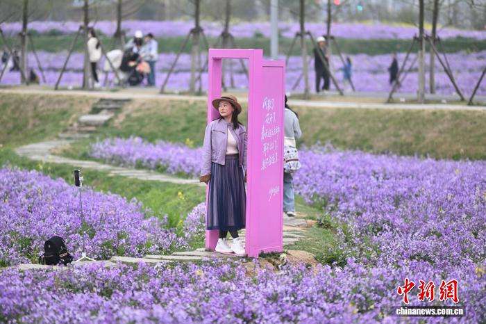 近日,安徽合肥肥西县派园的油菜花、二月兰等鲜花竞相绽放,铺展成一片绚烂花海,吸引民众漫步赏花,享受春天美好时光。图为3月26日,民众在公园游玩赏花。