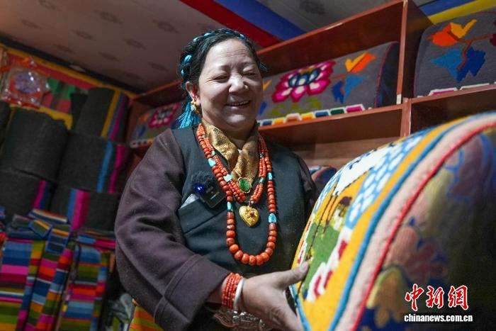 3月25日,“记录雪域民族团结 见证珠峰发展新篇——石榴花开心连心”网络主题活动采访团,走进西藏日喀则市岗巴县乃村顺心编织合作社,探访当地传统民族手工艺发展新貌。据了解,合作社理事长德吉自2015年深耕卡垫、氆氇等传统手工编织技艺,凭借精湛手艺与家乡情怀,成为当地手工艺带头人。2019年,她牵头成立顺心编织合作社,2025年在各方持续支持下,合作社发展再上新台阶。如今,合作社已吸纳28名妇女就近稳定就业,让传统“指尖技艺”成功转化为“指尖经济”。图为德吉正在展示产品。
