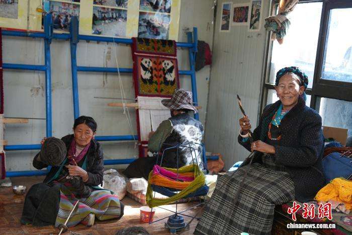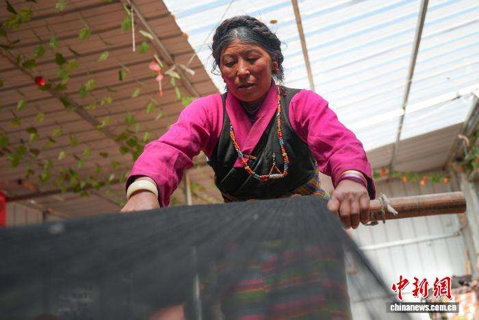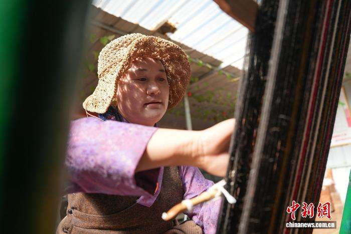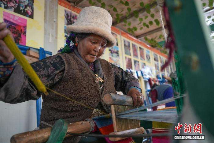 合作社员工旦卓正在编织邦典(藏式围裙)。