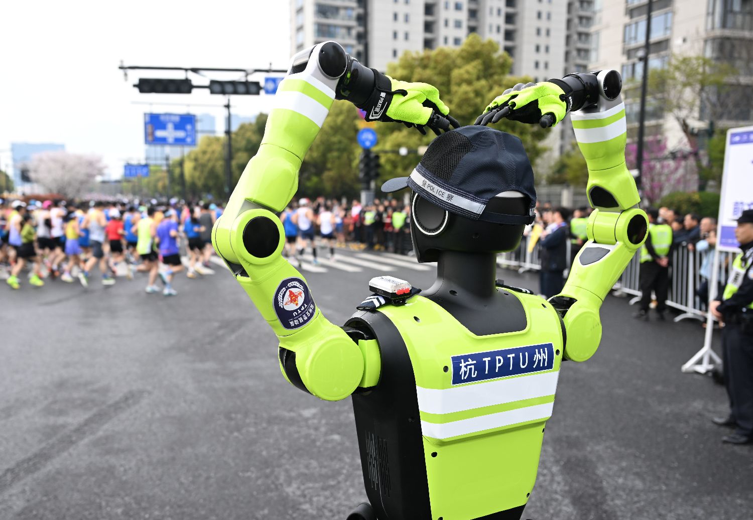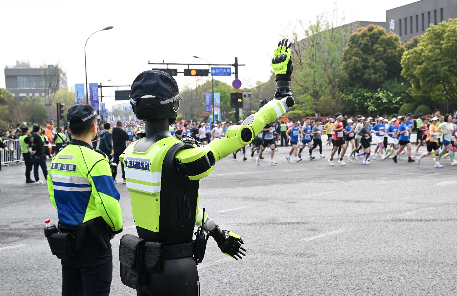 3月29日,2026杭州梦想小镇半程马拉松在浙江杭州余杭未来科技城开跑,当地公安引入AI交通管理机器人、AR眼镜等设备,以科技力量护航城市马拉松。图为当日,AI交通管理机器人向马拉松跑者作出“比心”动作。