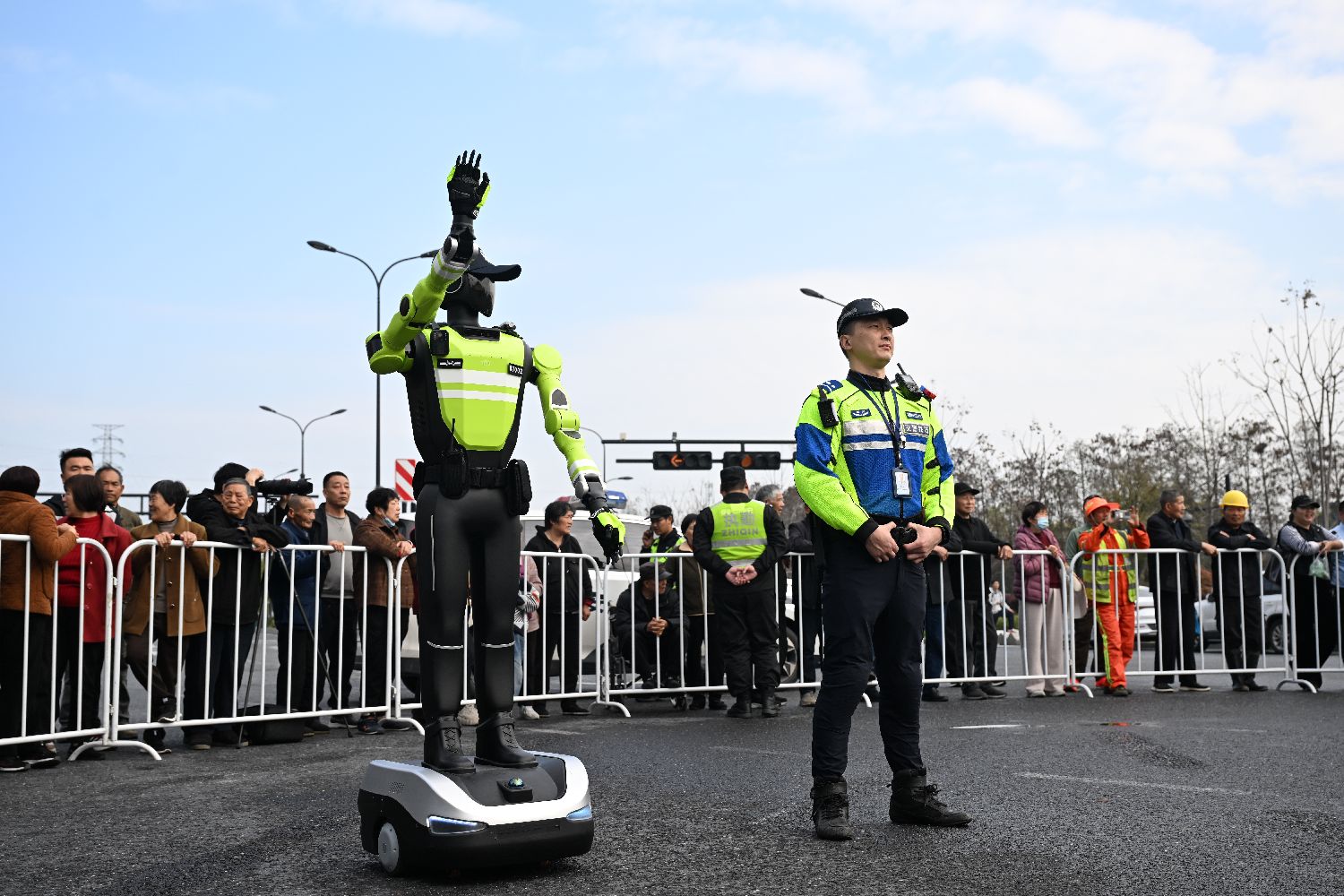 3月29日,AI交通管理机器人(左)在交警旁边引导马拉松跑者。
