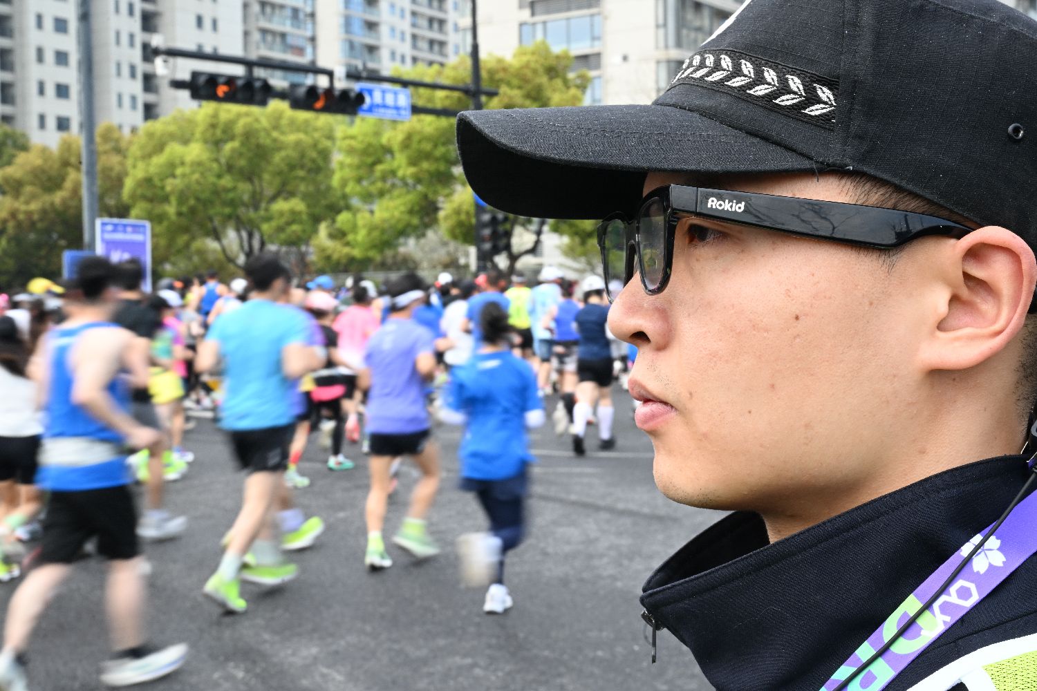 3月29日,民警佩戴AR智能眼镜在马拉松现场执勤。