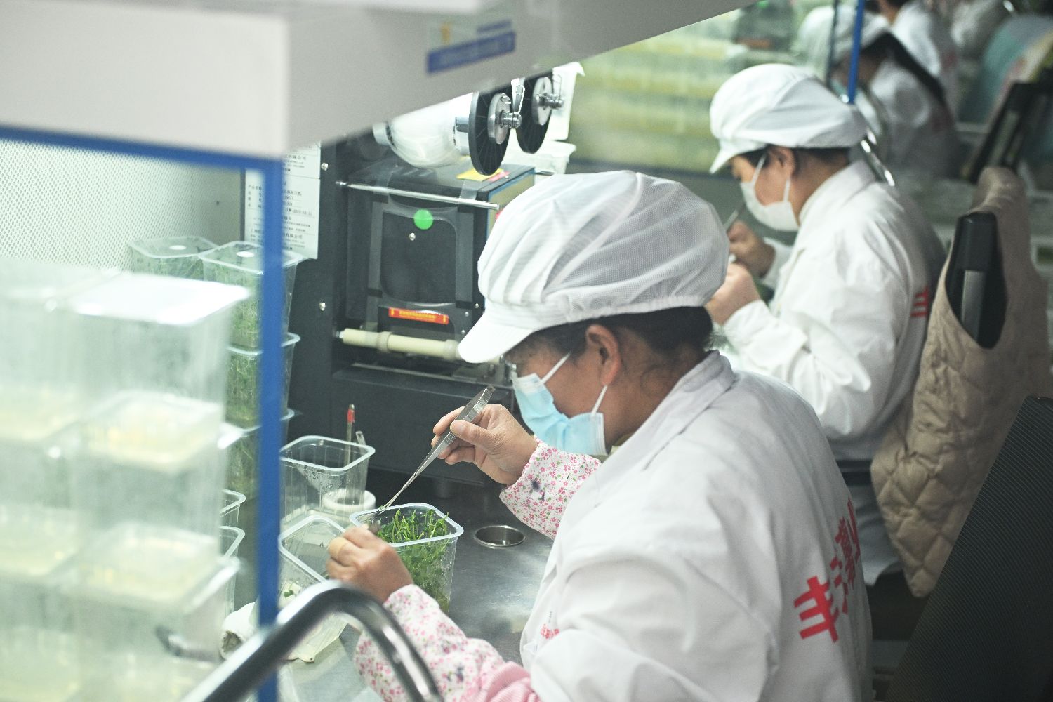 3月29日,在位于甘肃省定西市安定区鲁家沟镇小岔口村的马铃薯产业园组培室内,组培人员进行马铃薯原原种脱毒苗扩繁工作。