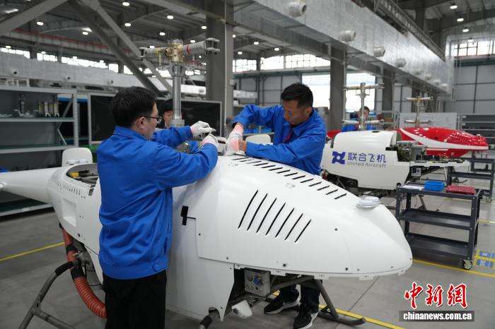 芜湖联合飞机科技有限公司工作人员正在组装调试无人直升机。