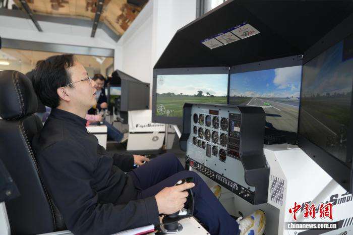 参观者在东方飞谷航空飞行营地体验模拟飞行。