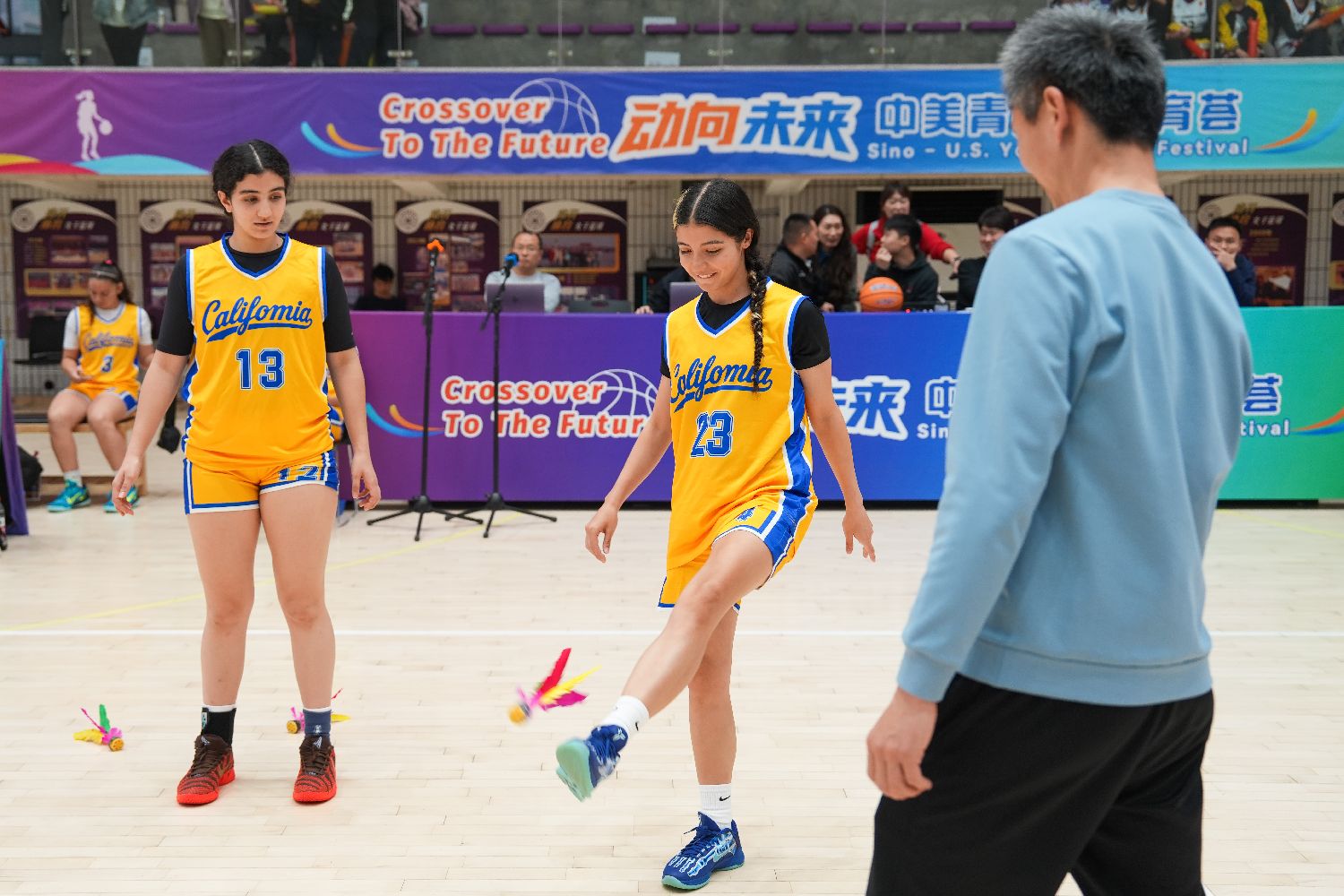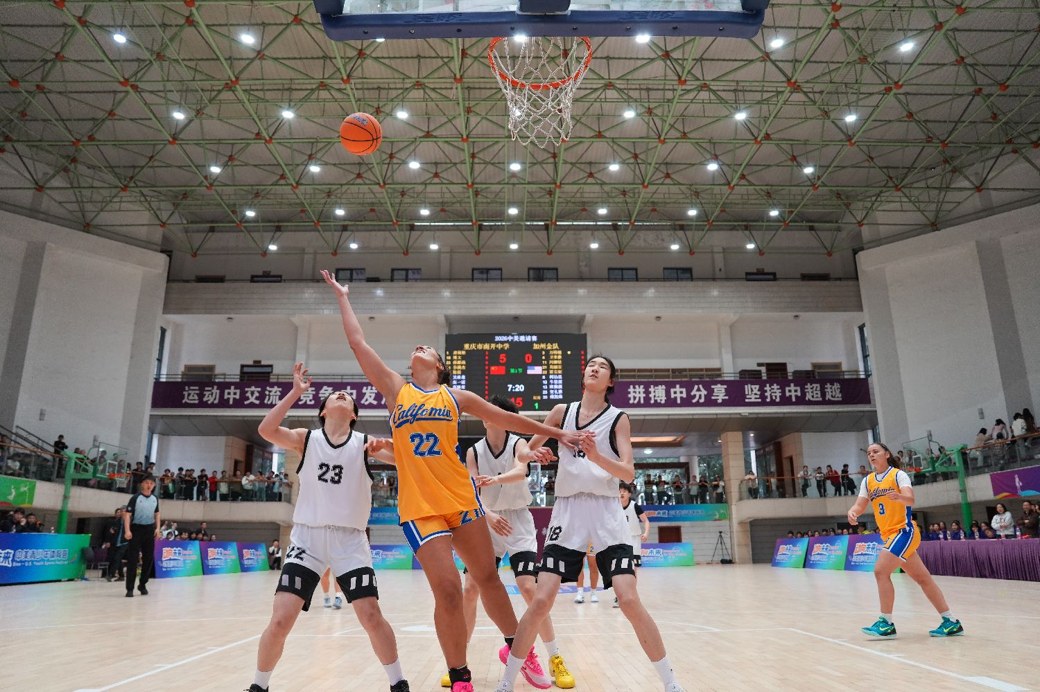 3月30日,赴渝参加2026“动向未来——中美青少年体育荟”篮球活动的美国加利福尼亚州10所中学的46名女子篮球队员及教练员,走进重庆市南开中学,与中国学生切磋篮球技艺,并体验踢毽子等中国传统民间体育项目。其间,美国青少年还展示了腰旗橄榄球运动,在多元体育交流中增进了解、深化友谊。图为加州金队(黄衣)与重庆南开中学女子篮球队进行友谊赛。