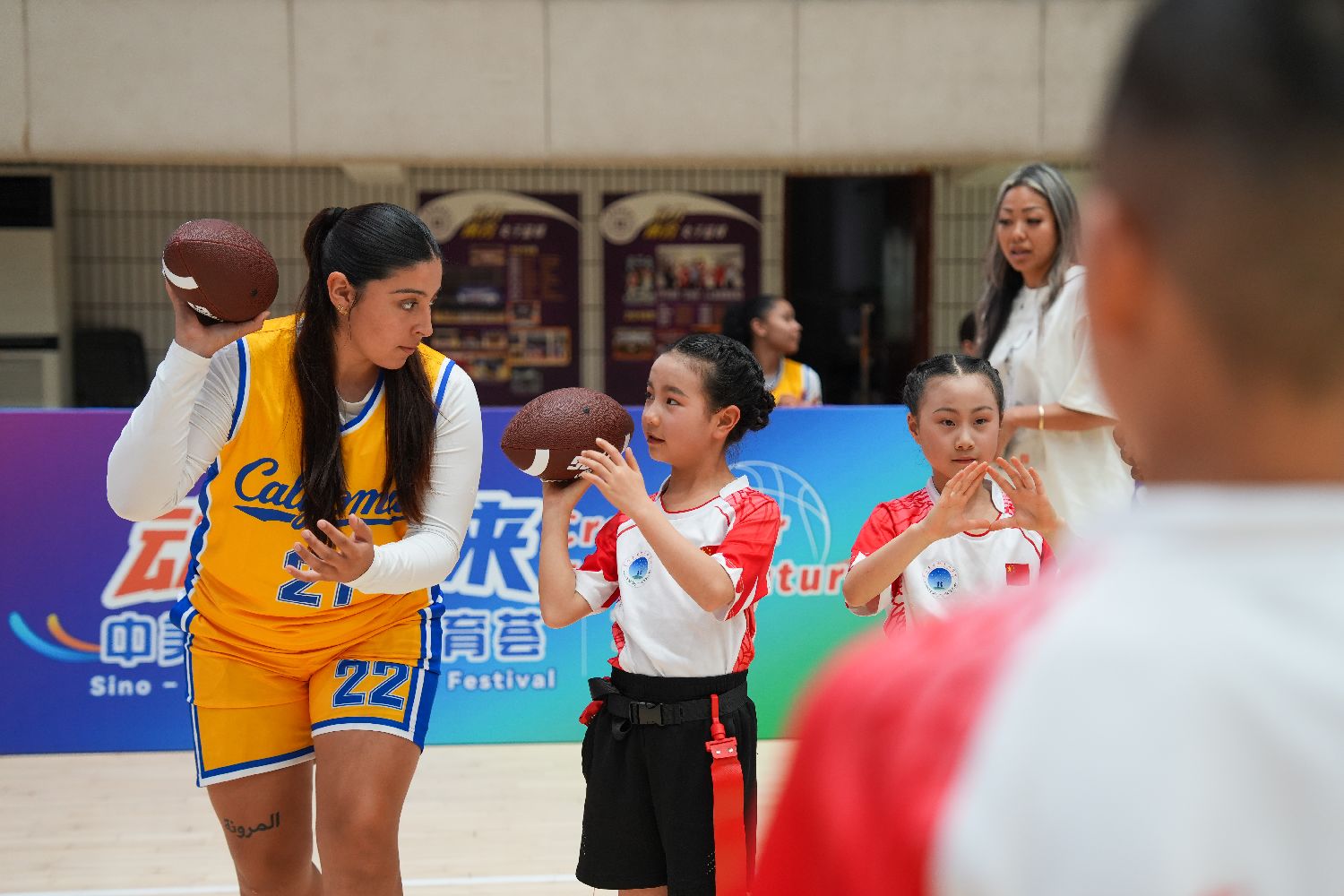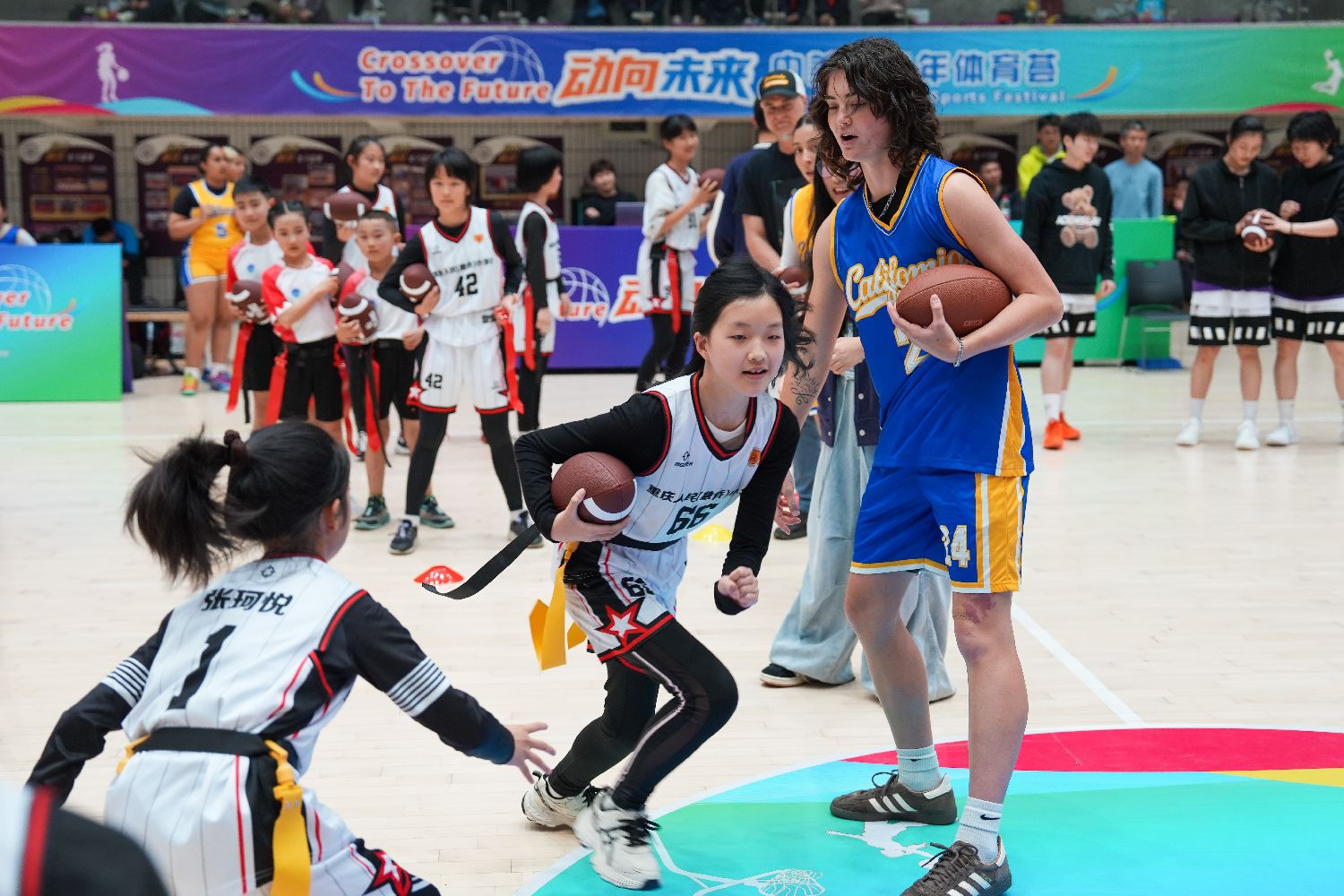 中美青少年在重庆南开中学交流腰旗橄榄球。