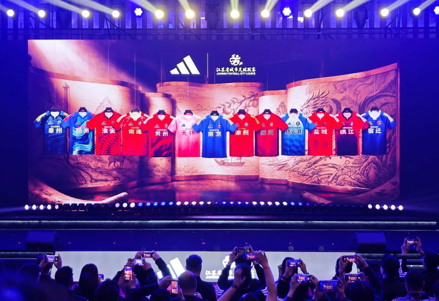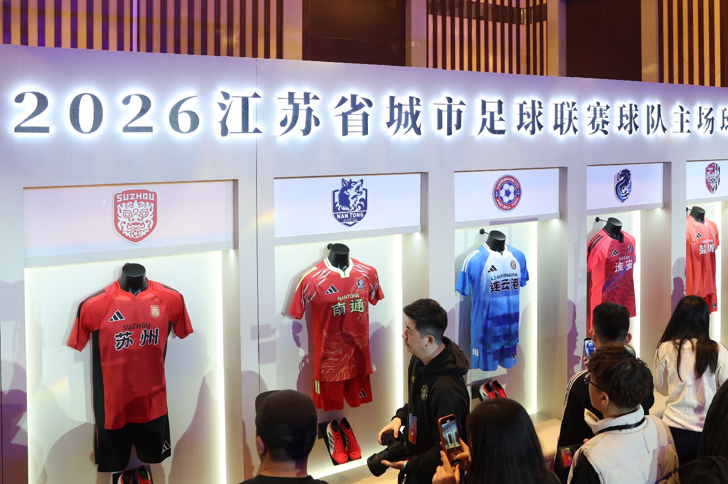 3月31日,2026江苏省城市足球联赛(苏超)13支球队主客场比赛服在江苏南京发布。队服设计紧扣城市历史文化与当代精神,由阿迪达斯上海创意中心与江苏各地相关部门及球队共同打造,在专业运动性能基础上,呈现每座城市的气质与文化底蕴。图为比赛服亮相。