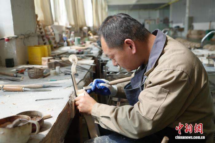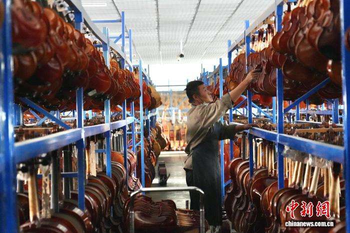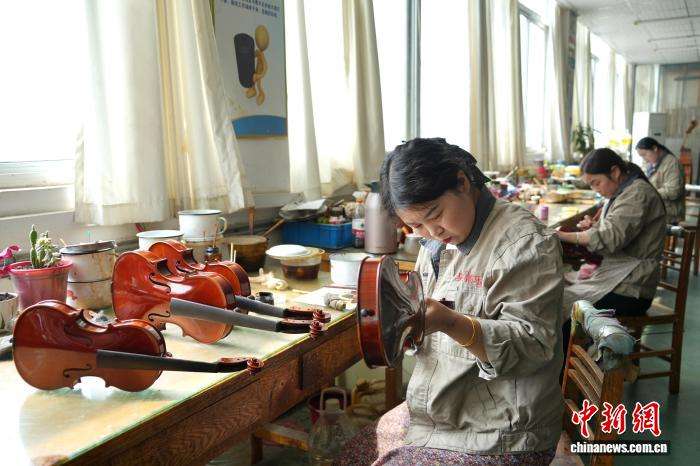 3月31日,“开局之年看中国·原来你是这样的河南”网络主题宣传活动走进河南驻马店确山县提琴产业园。目前,该县拥有提琴制造企业百余家,已形成集原材料加工、琴体制作、配件生产于一体的完整产业链。当地提琴产量占中国总产量的四成以上,产品远销30余个国家和地区。图为工人正在制作小提琴。