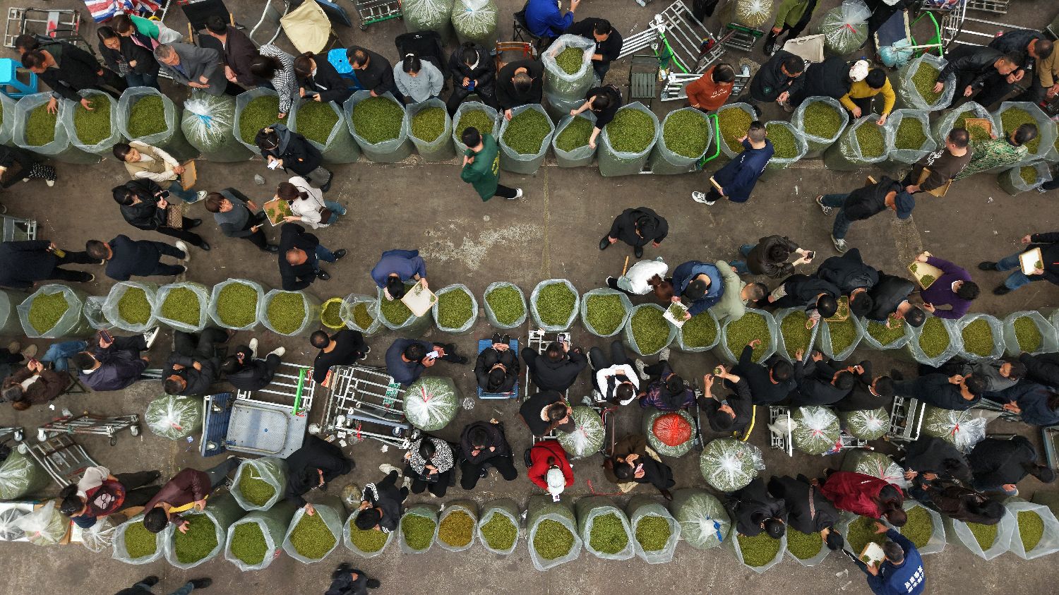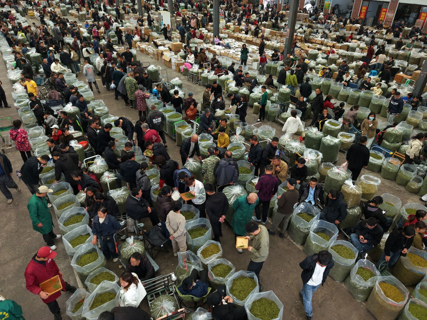 当前正值中国春茶上市时节,位于浙江省丽水市松阳县的浙南茶叶市场汇聚了各地的茶农和茶商,市场内春茶交易繁忙。该市场为中国最大的绿茶产地市场,十余个产茶省的茶叶在此集散,惠及300余万茶农。图为3月31日,茶叶市场交易大厅内人头攒动。(无人机照片)