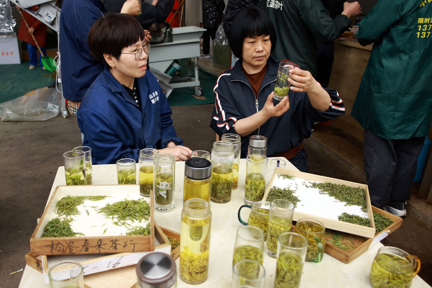 3月31日,茶商(右)查看新茶汤色。