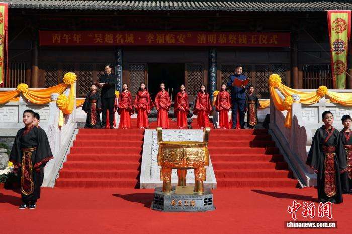 4月2日,在清明恭祭钱王仪式上,钱氏后裔与杭州市临安区学生共读《钱氏家训》。