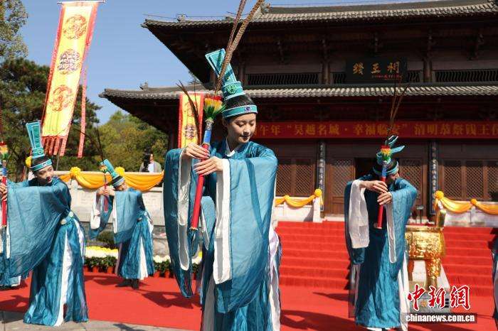 4月2日,在清明恭祭钱王仪式上,表演者以乐舞敬拜钱王。