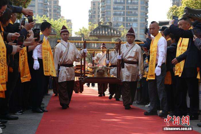 4月2日,在清明恭祭钱王仪式上,工作人员抬着供品敬奉钱王。