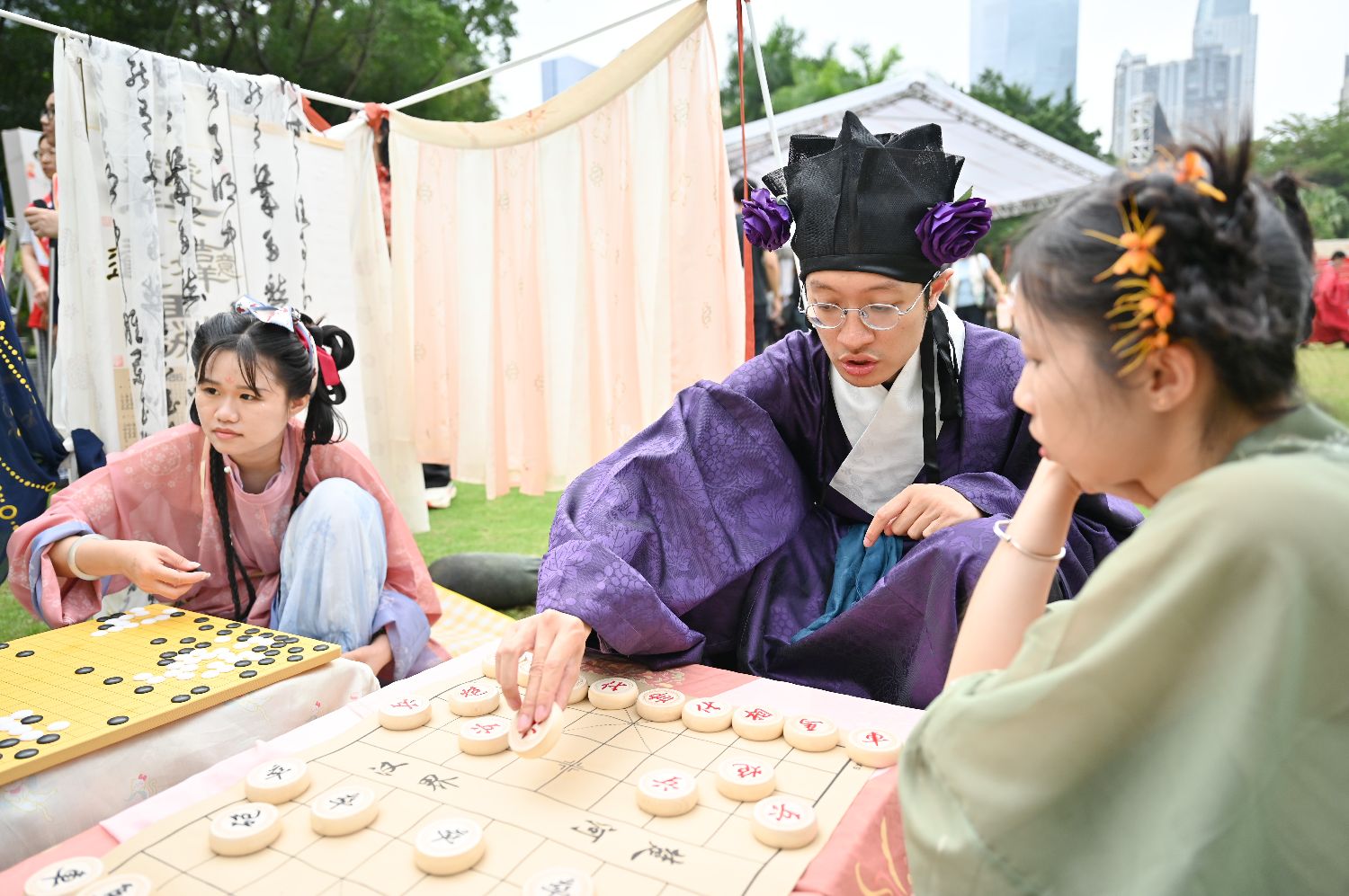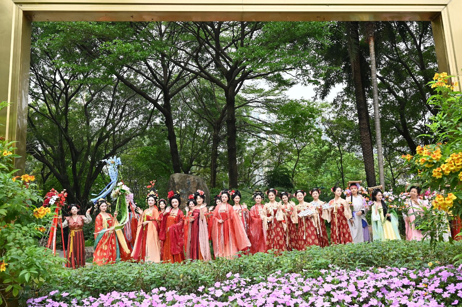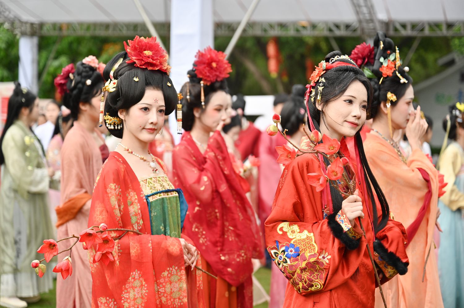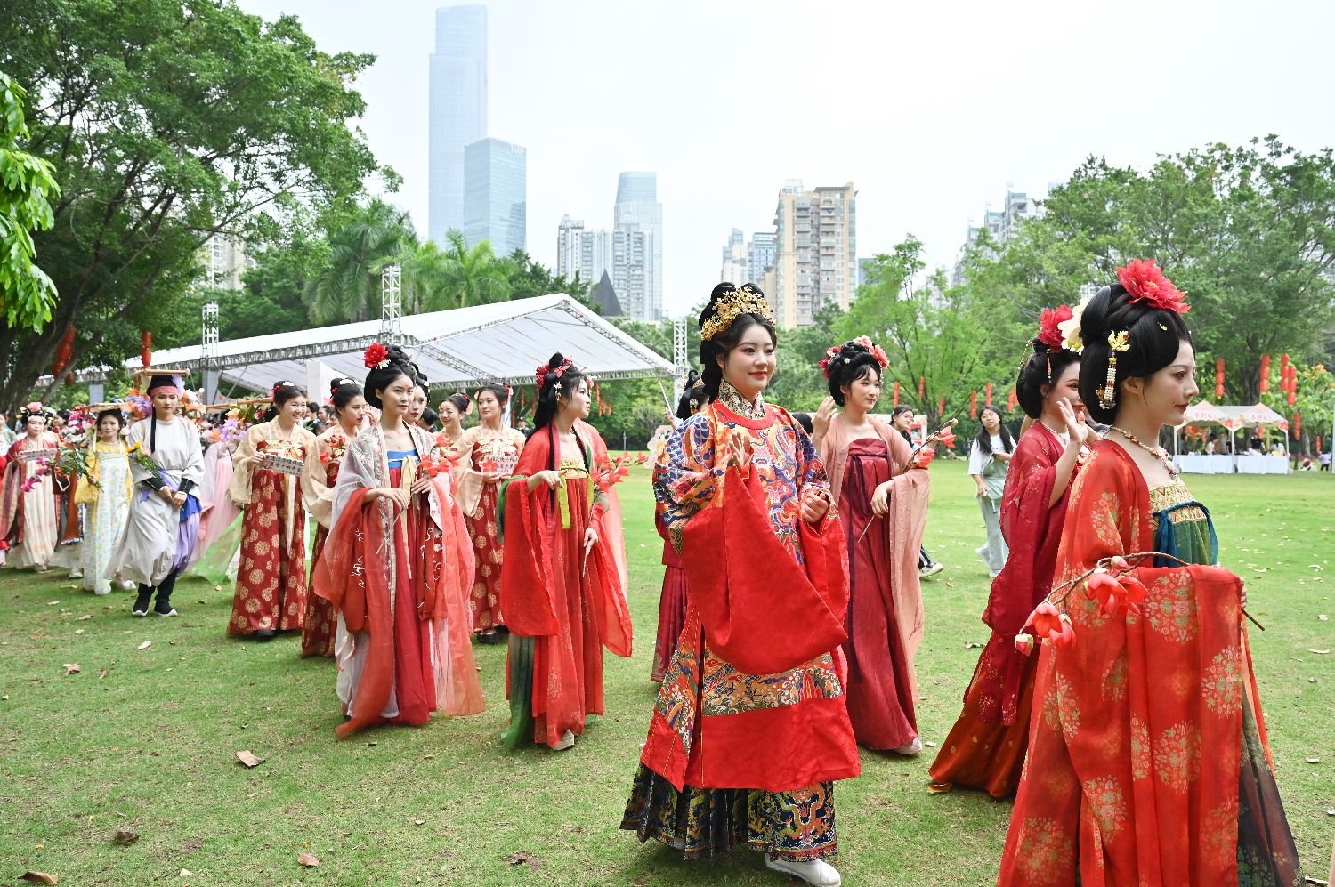 穿着汉服的工作人员手持花枝在珠江公园巡游。
