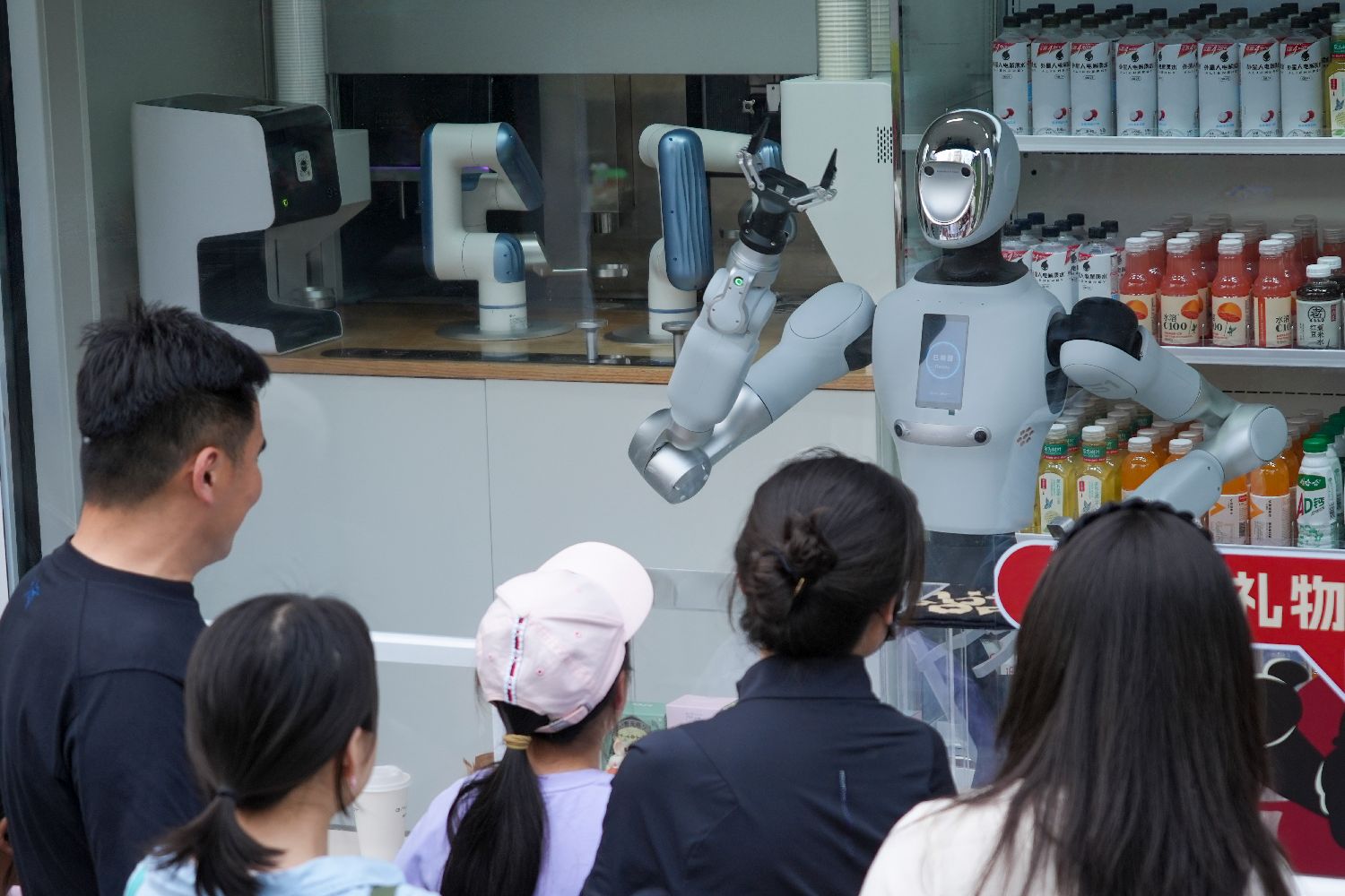 机器人“店员”将顾客下单的饮料递送至出货口。