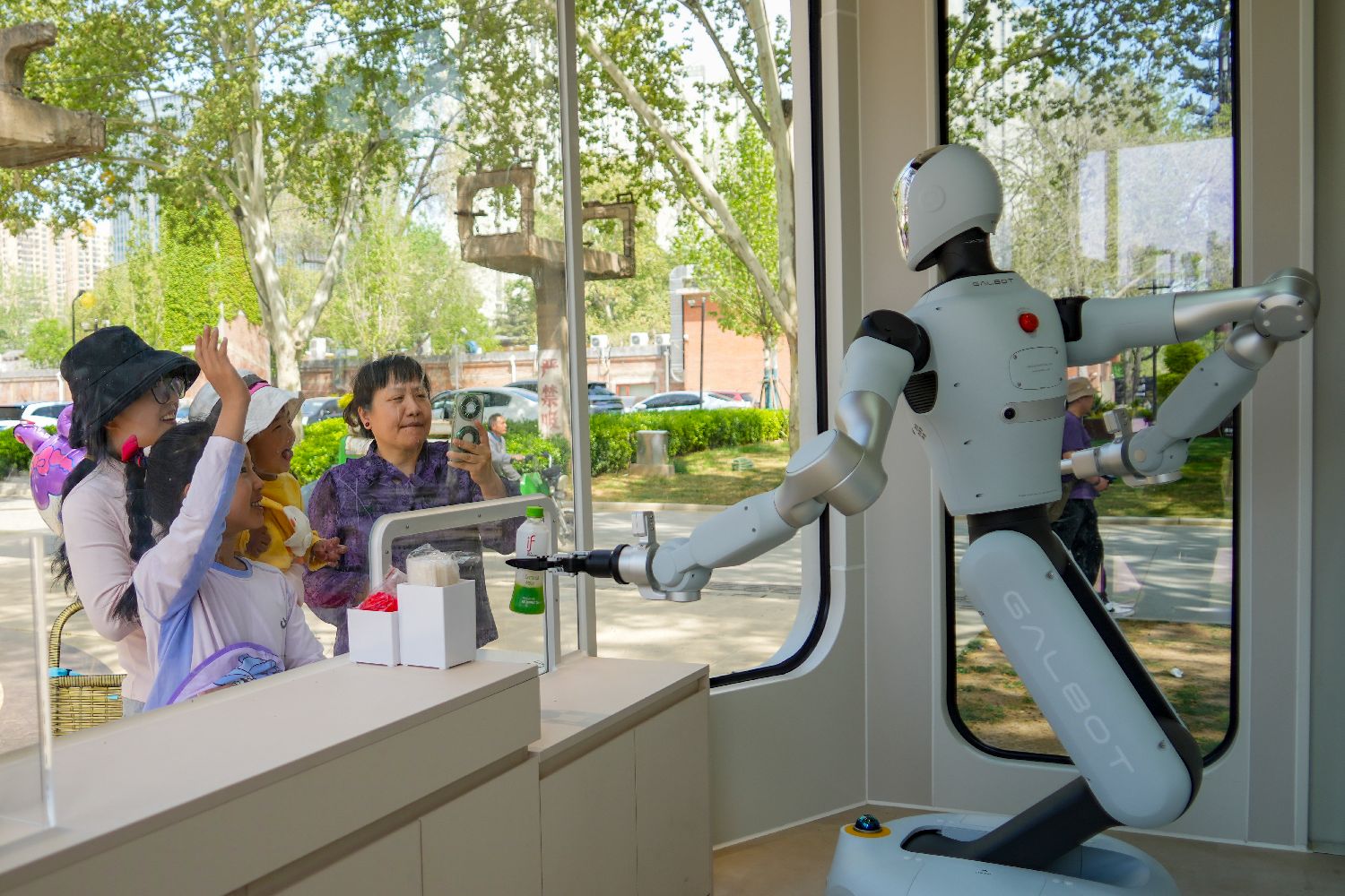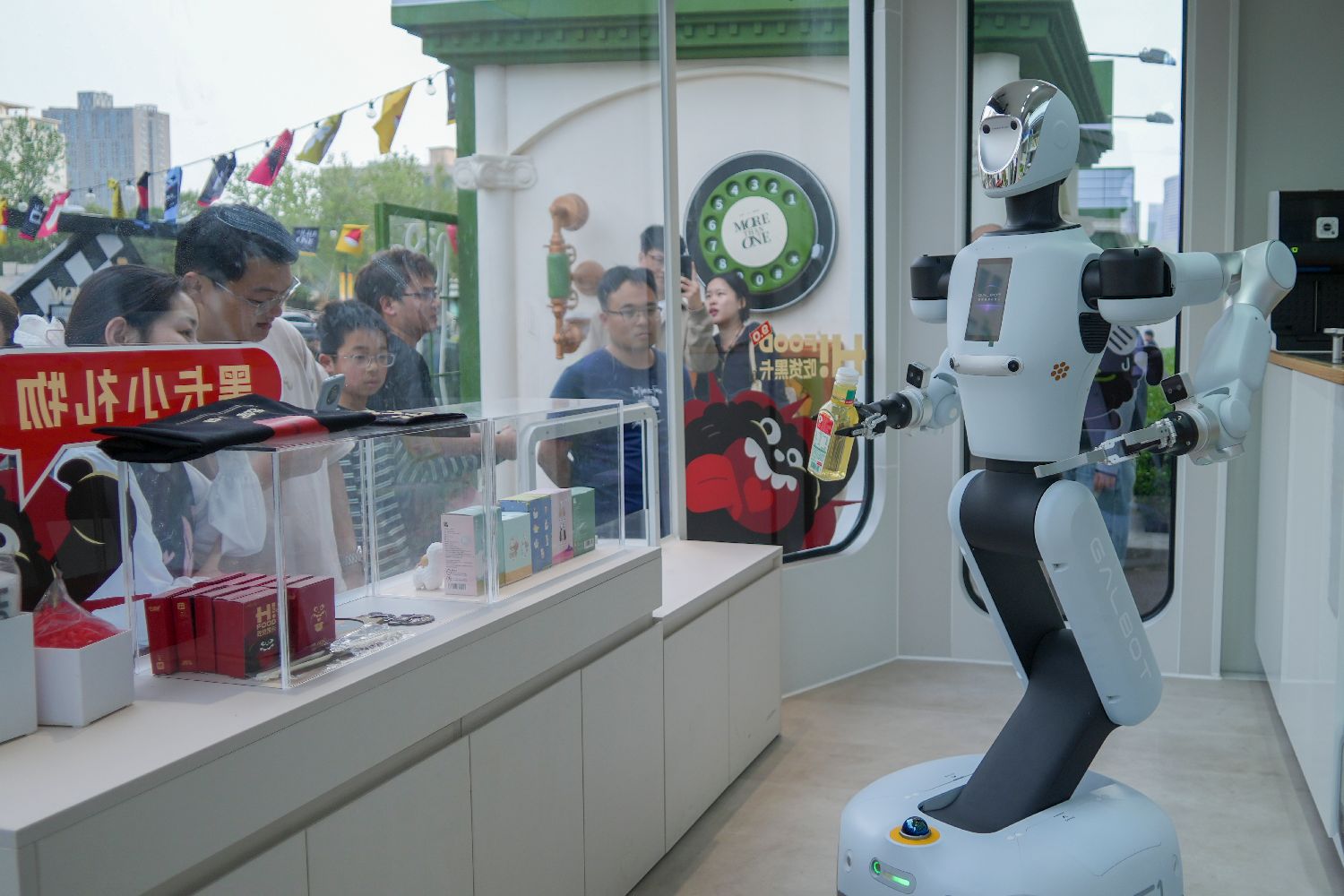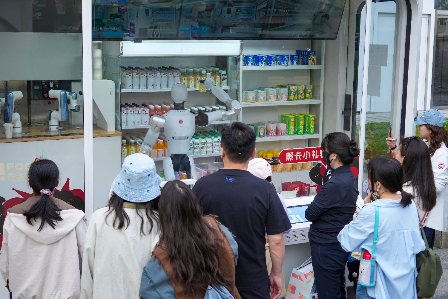 4月6日,河南郑州,街头出现人形机器人“店员”,为顾客提供智能售卖服务。图为机器人“店员”吸引市民驻足观看。