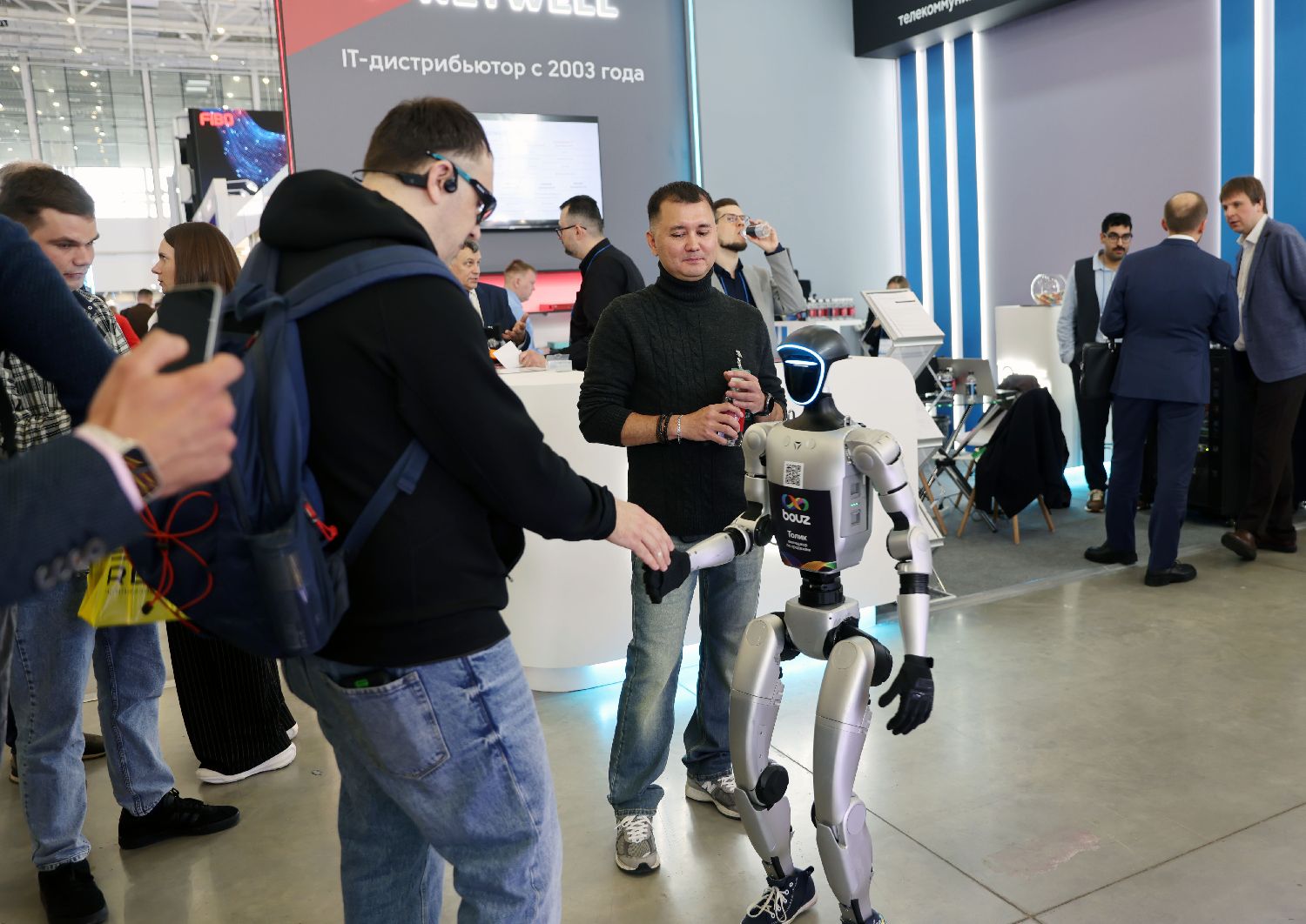 展览会上机器人与参观者互动。