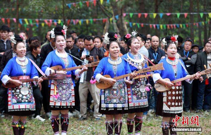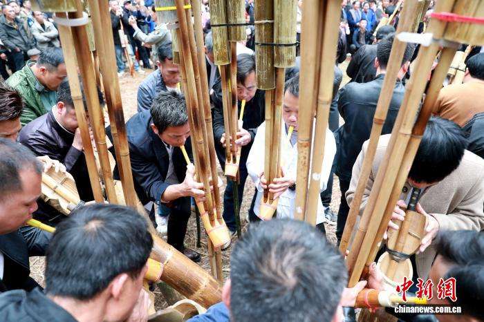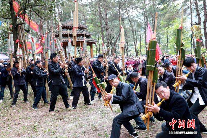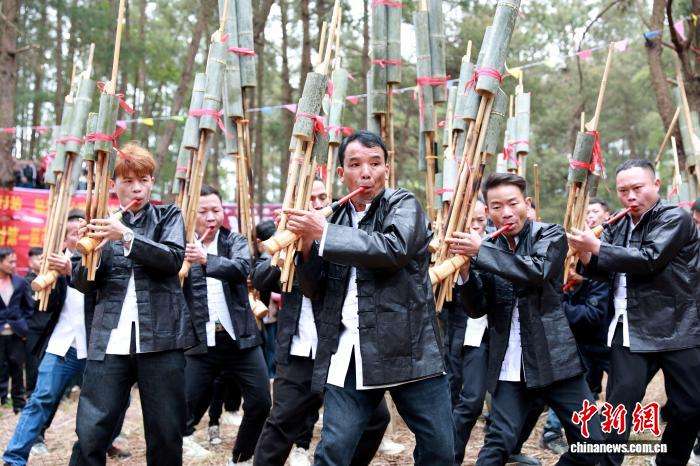 4月7日,广西三江侗族自治县独峒镇林略村举办第一届“琵琶歌节”暨“三月三”芦笙大赛,来自广西三江及贵州黎平等地的25支芦笙队齐聚该村松树坪,以芦笙踩堂、侗族琵琶歌、芦笙比响等丰富形式,尽展侗乡多彩风情,促进各民族交往交流交融。图为民众在赛芦笙。
