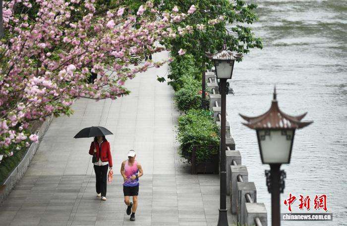 市民在盛开的樱花下跑步健身。