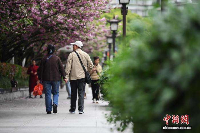 一对老年夫妇正携手同行在盛开的樱花下。