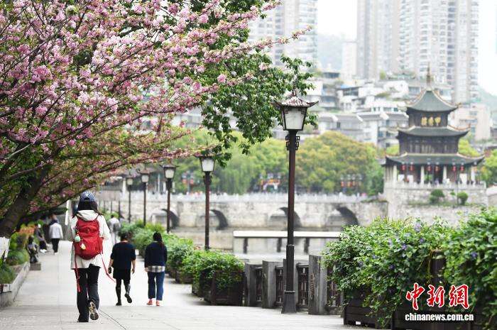 春暖花开时节,位于贵州省贵阳市南明河沿岸的樱花竞相绽放,吸引游客赏花游玩、拍照打卡,尽享明媚春光。图为小朋友伸手触碰樱花。