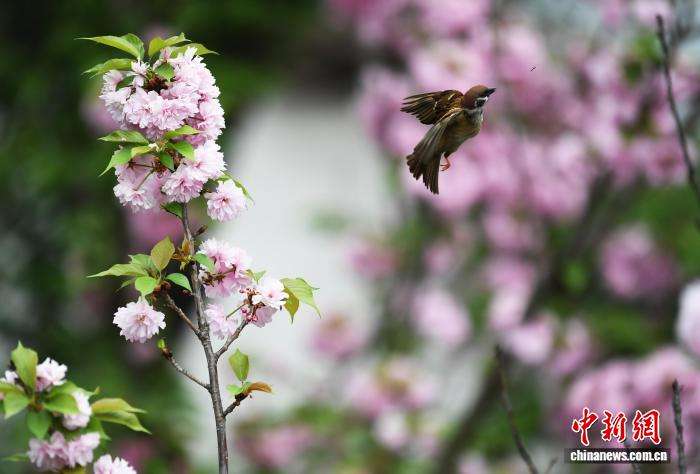 一只麻雀正在樱花丛中觅食。