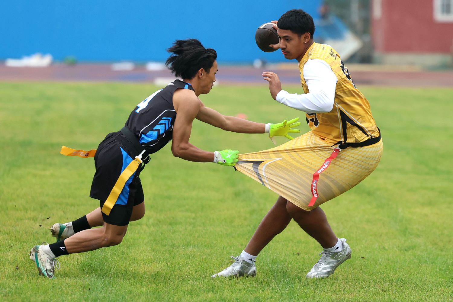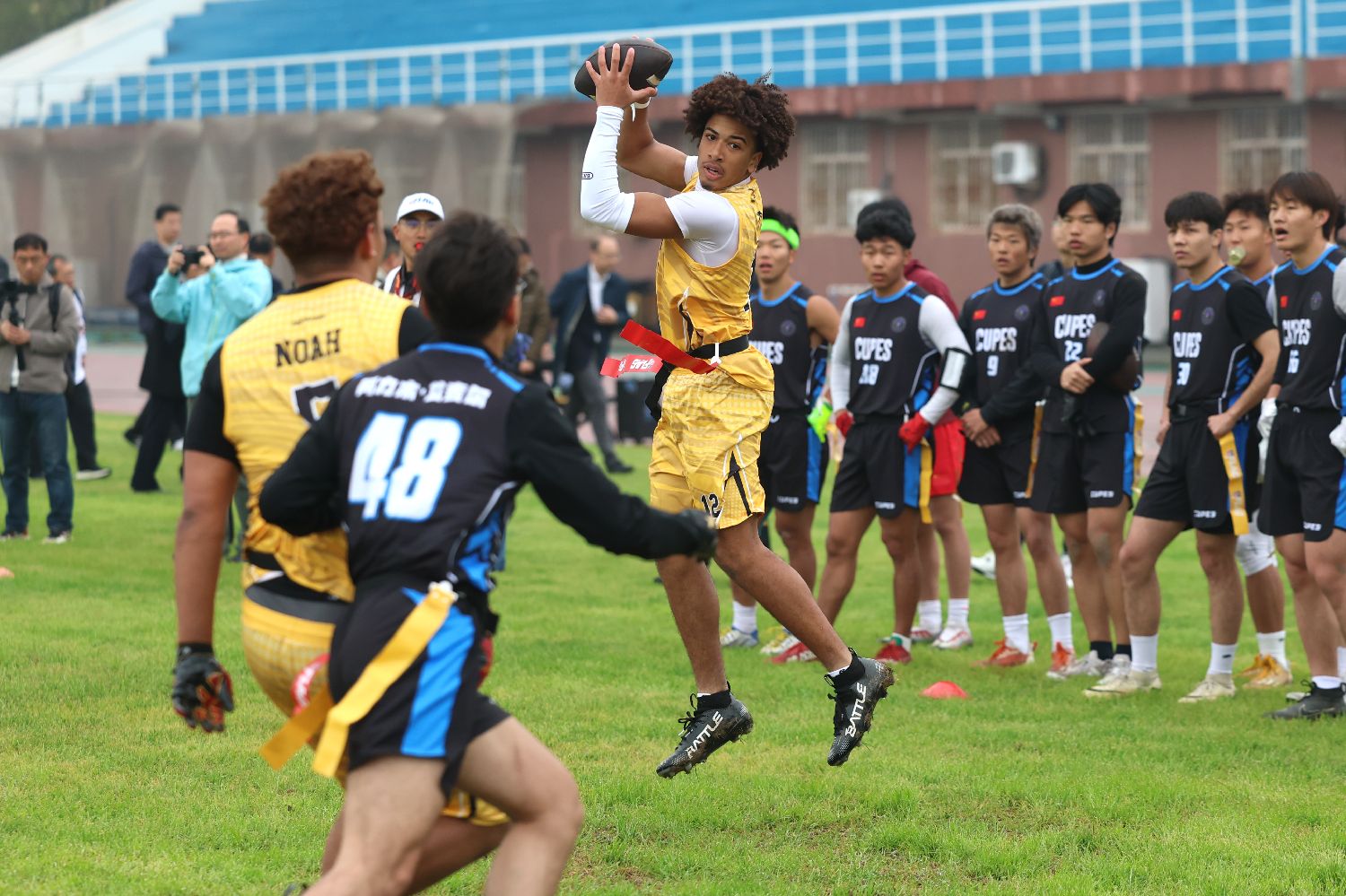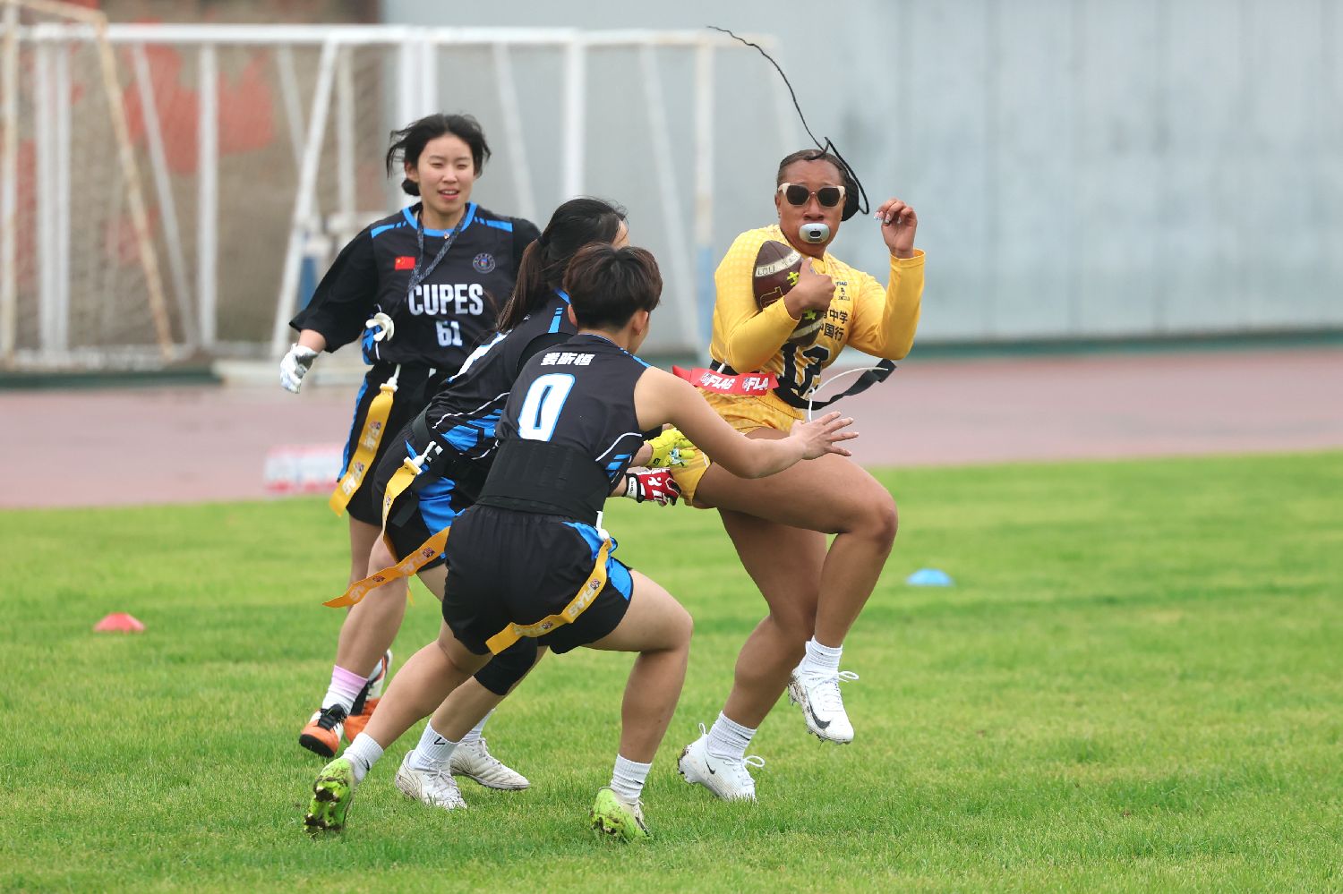 4月9日,美国华盛顿州塔科马市林肯中学腰旗橄榄球队(黄)与首都体育学院的腰旗橄榄球社团展开友谊赛。