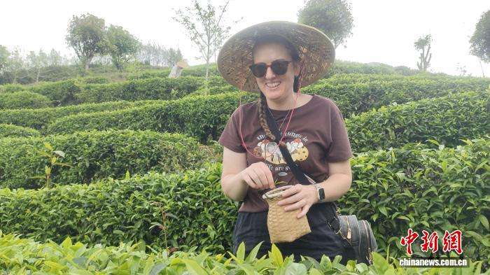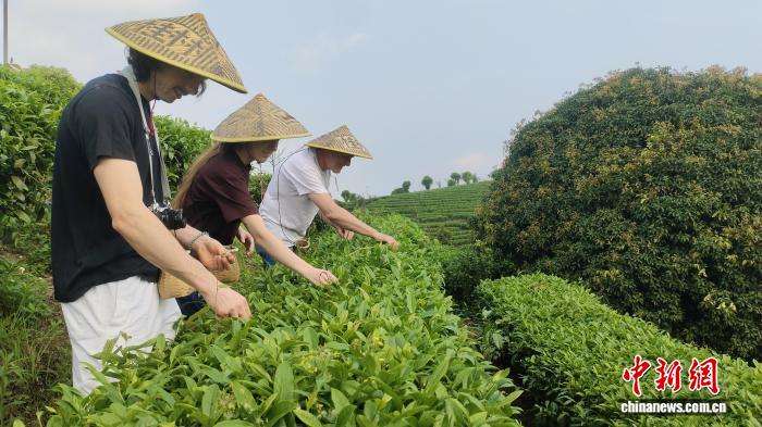 外国游客在广西桂林市阳朔县七仙峰茶场体验采茶。