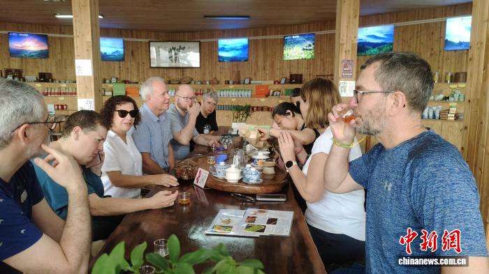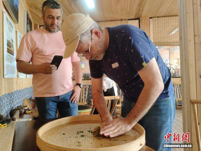 外国游客在广西桂林市阳朔县七仙峰茶场体验茶叶制作。