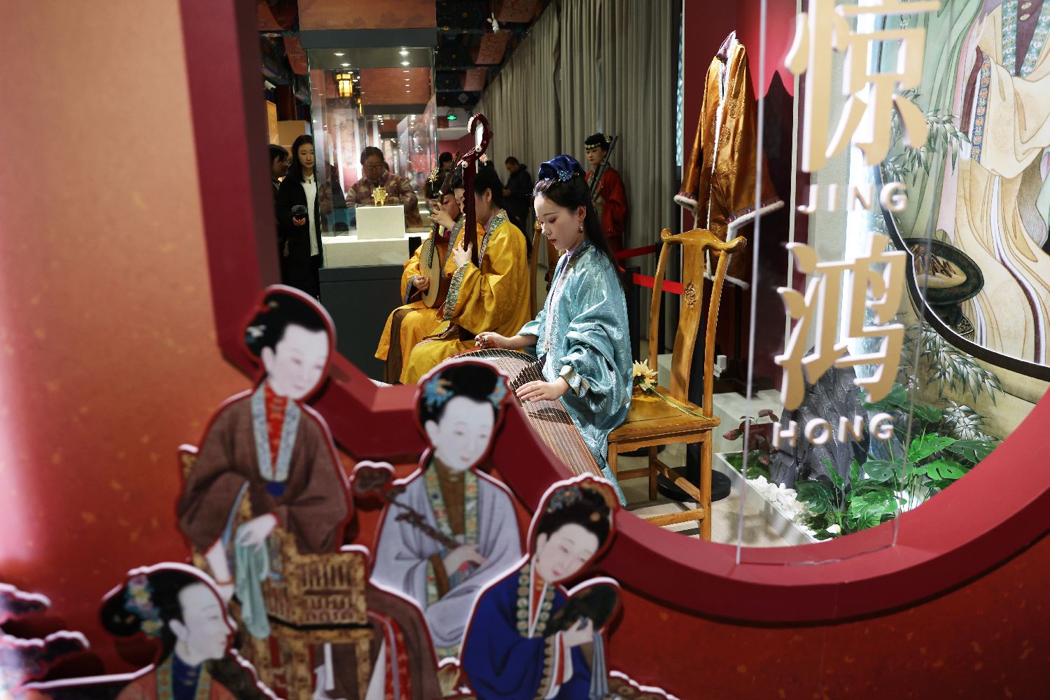 4月9日,“十二美人”在北京圆明园内“屏影惊鸿——雍正十二美人图岁时雅韵展”现场表演。
