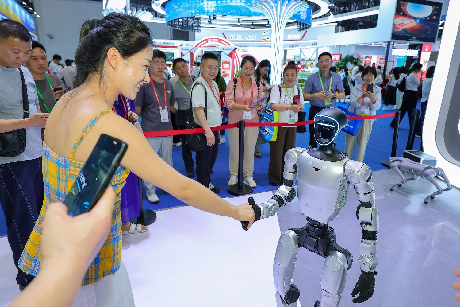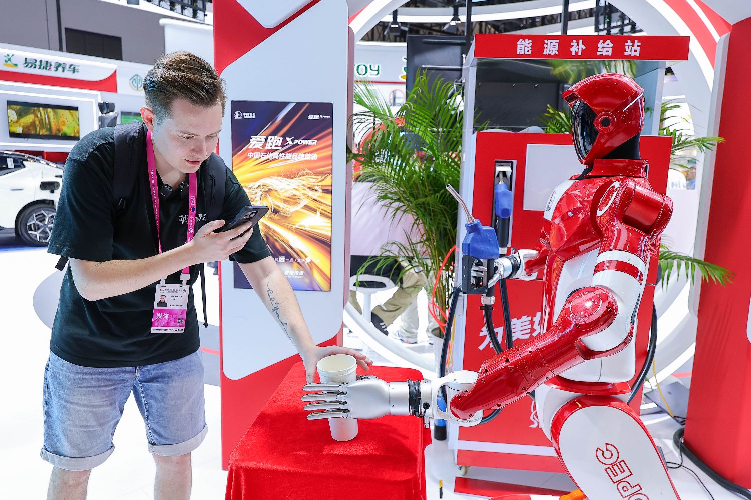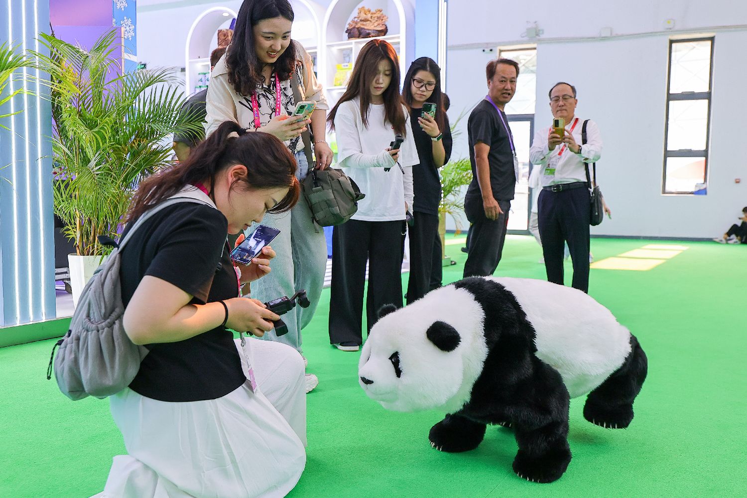 4月13日,第六届中国国际消费品博览会在海南海口举办。多款智能机器人集中亮相展会现场,凭借前沿科技与创新应用吸引不少参观者驻足观看、互动体验。图为一台机器人在用毛笔写“福”字。