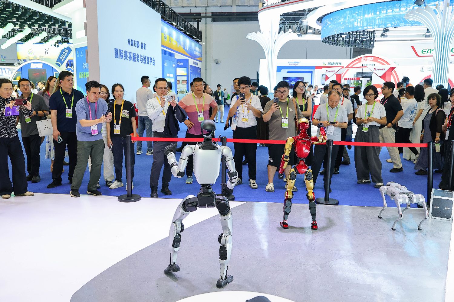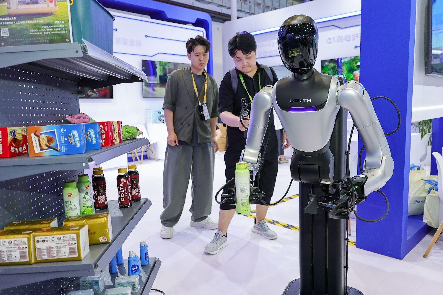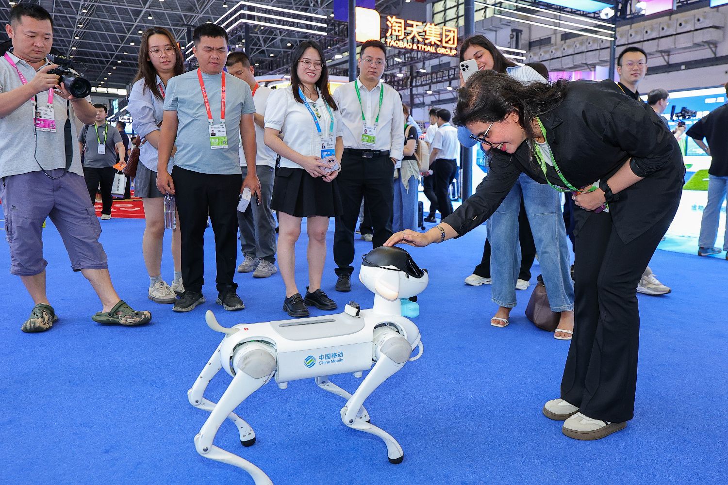 4月13日,第六届中国国际消费品博览会在海南海口举办。多款智能机器人集中亮相展会现场,凭借前沿科技与创新应用吸引不少参观者驻足观看、互动体验。图为一台机器人在用毛笔写“福”字。