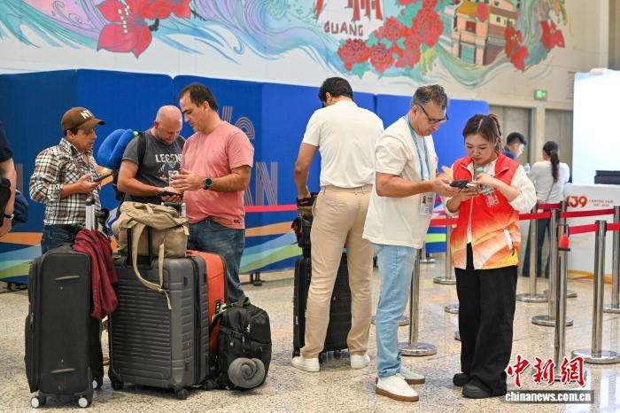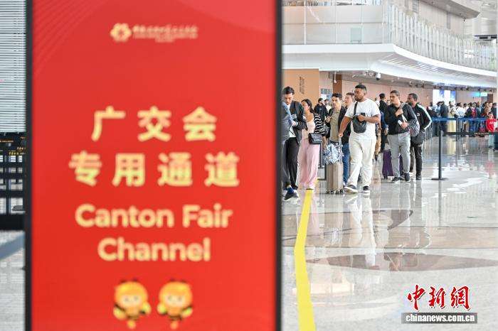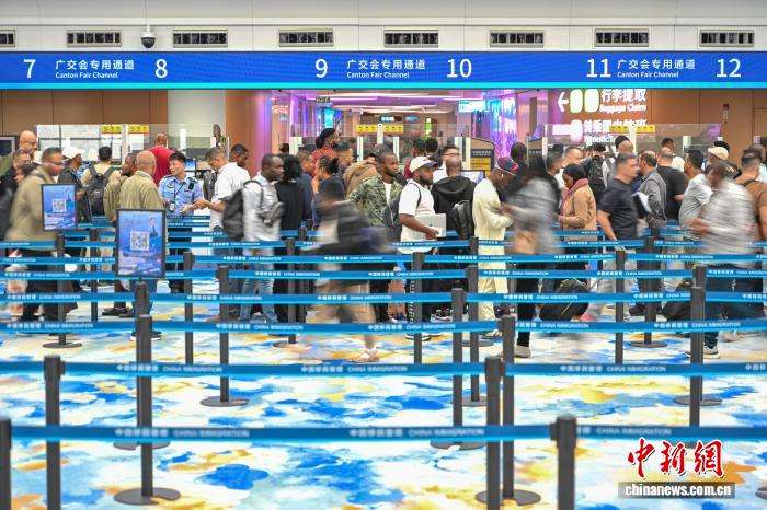 4月13日,外籍旅客在广州白云国际机场T2航站楼广交会专用通道办理入境手续。