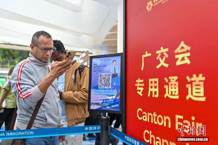 4月13日,外籍旅客在广州白云国际机场T3航站楼广交会专用通道办理入境手续。