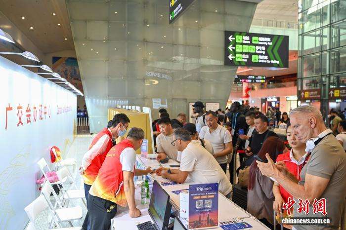 4月13日,外籍旅客在广州白云国际机场T2航站楼办理广交会证件。